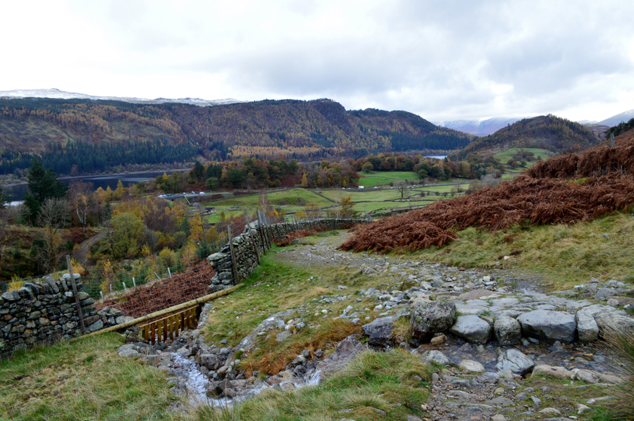 Kitted up I lock the car and strike out back up the hill towards Swirls car park (which I later found out was free to park on but more on that later) The air is mild and the ground is a little saturated and from the road I can hear the sound of Helvellyn Gill before it flows into Thirlmere via a aqueduct below my feet. There is only one car on the car park which starts to draw up along side me, a woman is driving whilst eating an apple and nods are shared through the windscreen. Up ahead the little wooden footbridge which crosses Helvellyn Gill before my path rises steeply towards Browncove Crags.