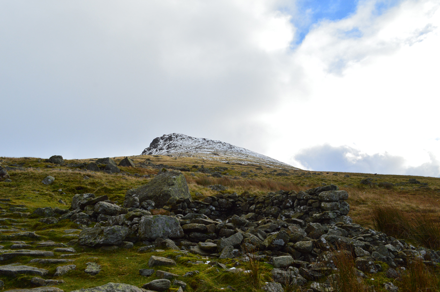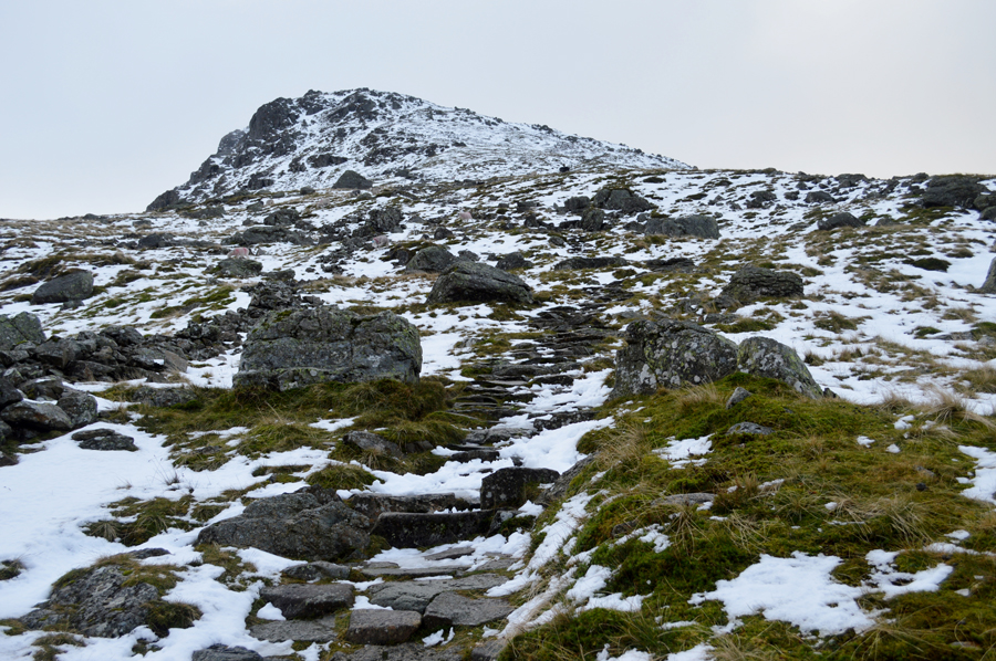 This lower section of the path is completely free from snow although thaw from further up the fell is running down leaving the cobble like stones that poke out of the ground quite slippery underfoot and care was taken if only to eliminate the one step up, two down routine. |
