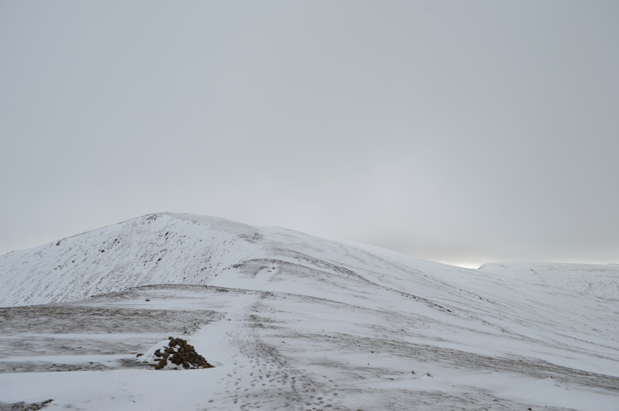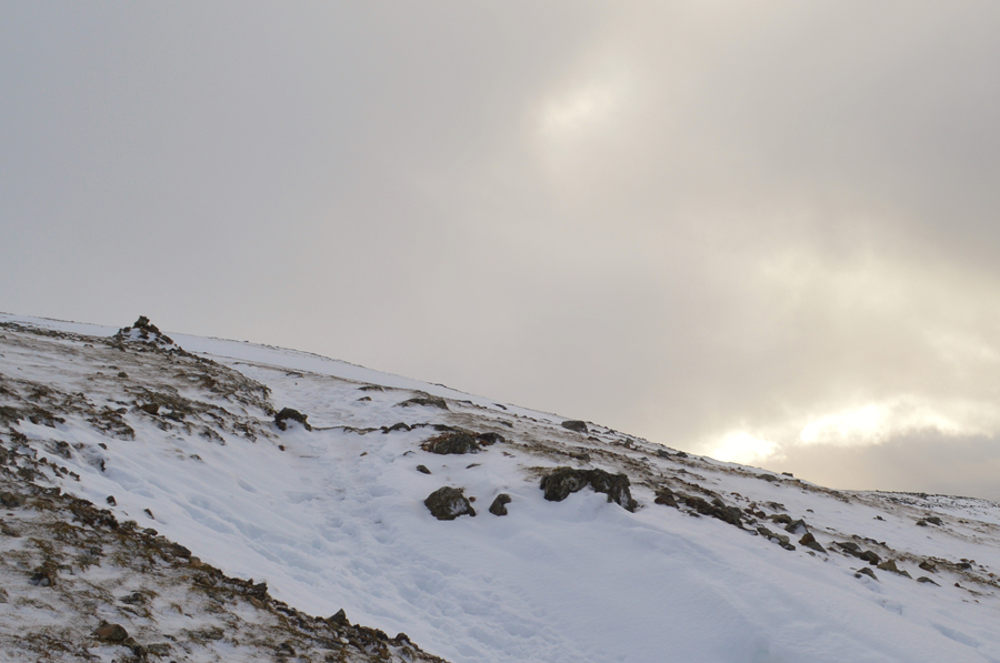 At times while on the shoulder of the fell it was easier to walk as the side of the path where the snow was only centimeters in depth rather than use the path where it had started to drift. |