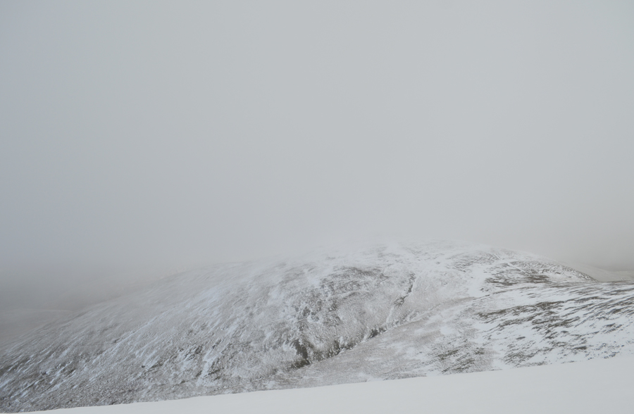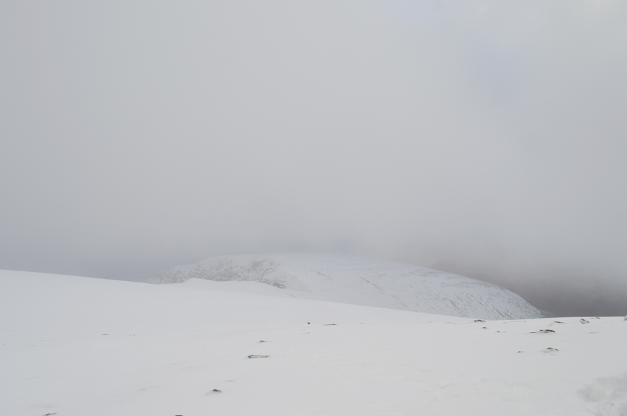 I pass the summit of Browncove Crags to my left and look down its steep gullies while observing the wondrous drifts along the summit edge. From afar and through the whiteness I can see the interconnecting snow covered ridge in between Lower Man and White Side whose summit is below cloud as too is Helvellyn. It brings a whole new meaning to the word bleak yet with the cloud dramatics further south, and bleakness of the mountain are what appeal to me most when walking in Wiinter. |