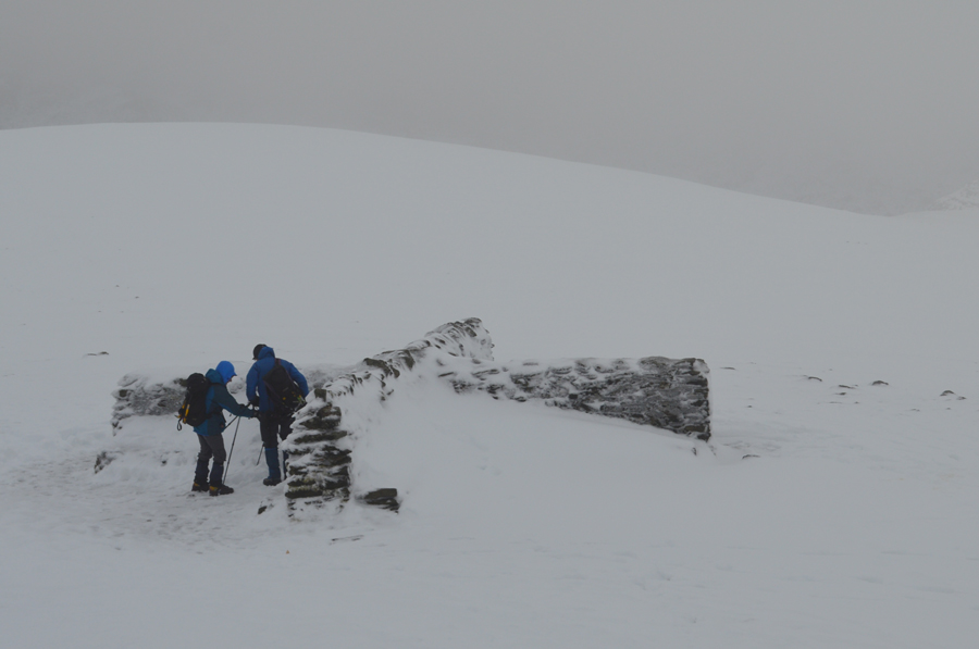 The stone shelter acted as a wind break as I took my mat out and placed it on the snow covered bench. I hadn't realised how dehydrated I had felt as I take long gulps from my hydration tube and start to eat lunch which I had problems digesting due to a sore throat that I had been suffering with over the last couple of days of which I hadn't noticed until I sat down and heard my breath wheezing slightly. The two gents asked me again had I managed to find my phone and I answered no by which time I had already planned my route of descent, it will be via Browncove as the gents went on to say third time lucky you never know.