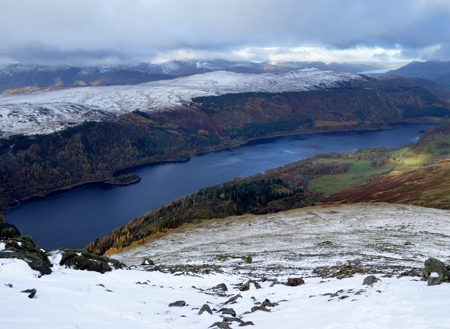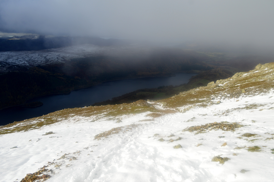 The view over Thirlmere now well into the snowline. |