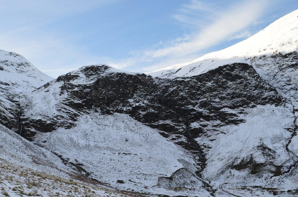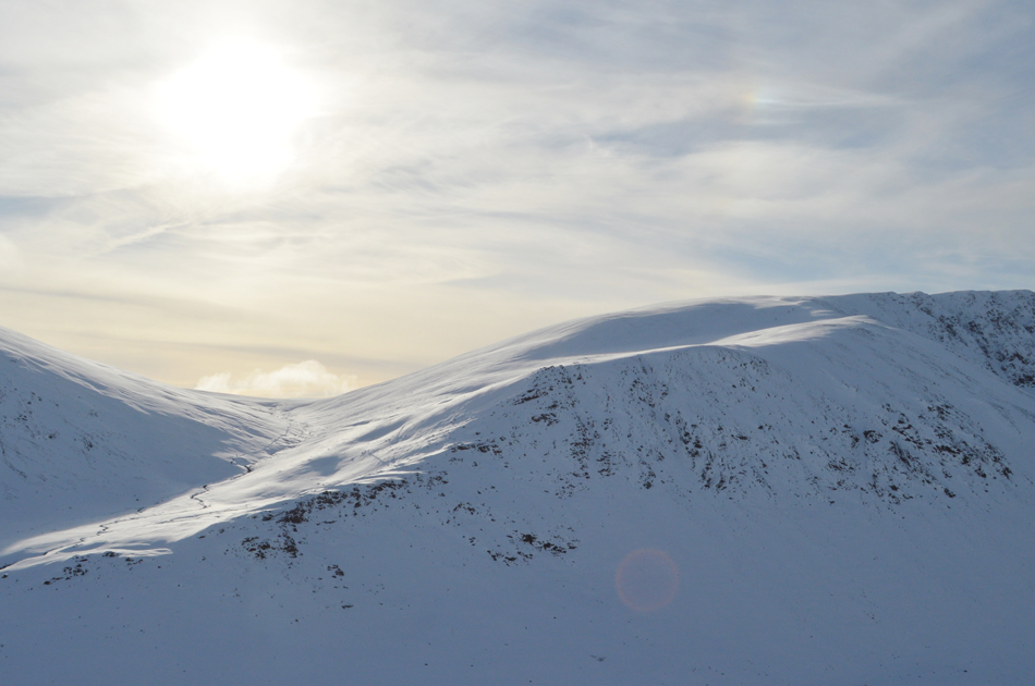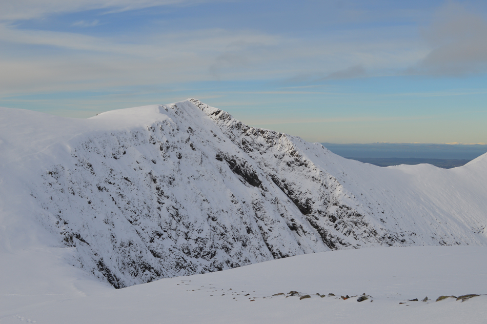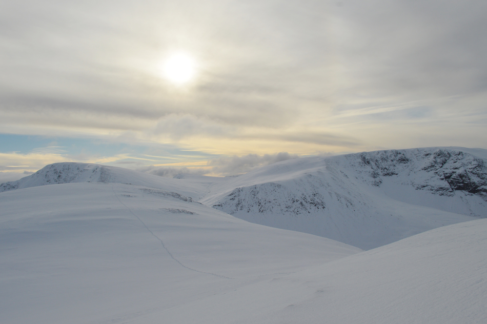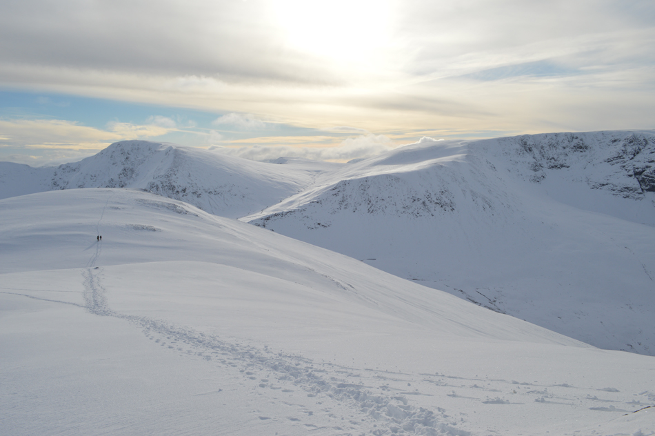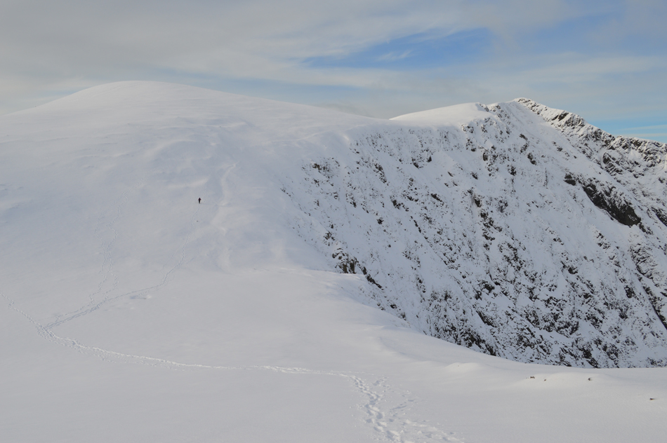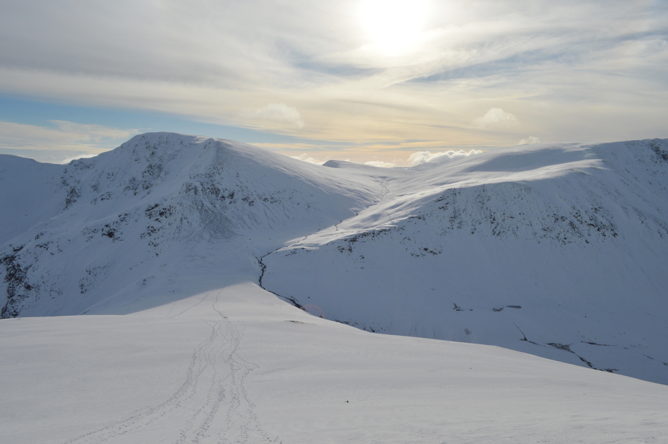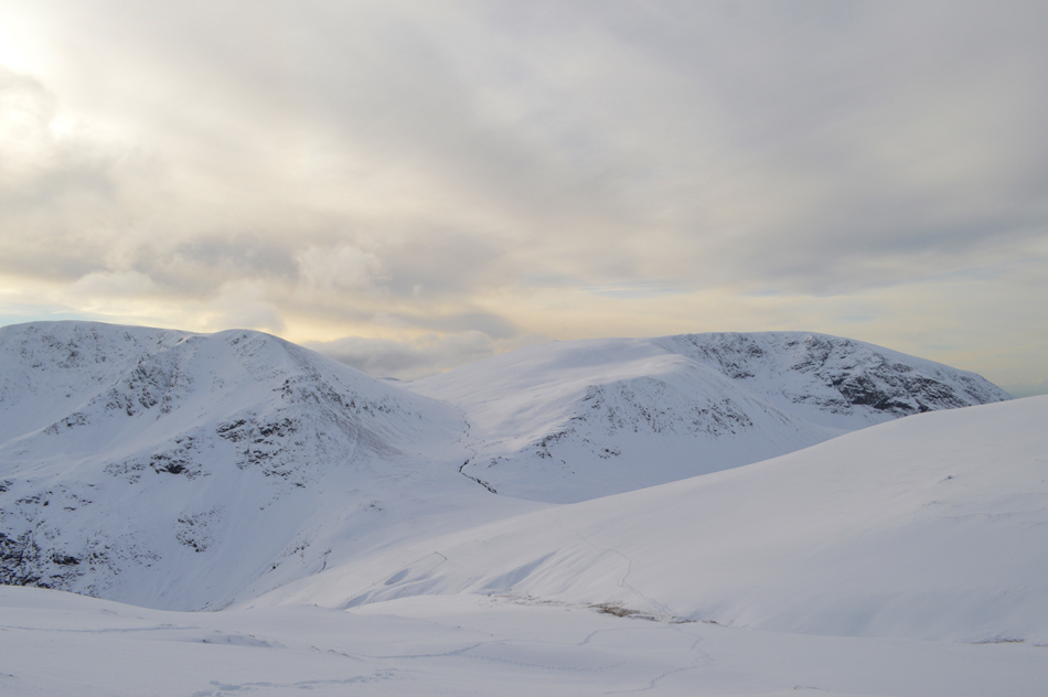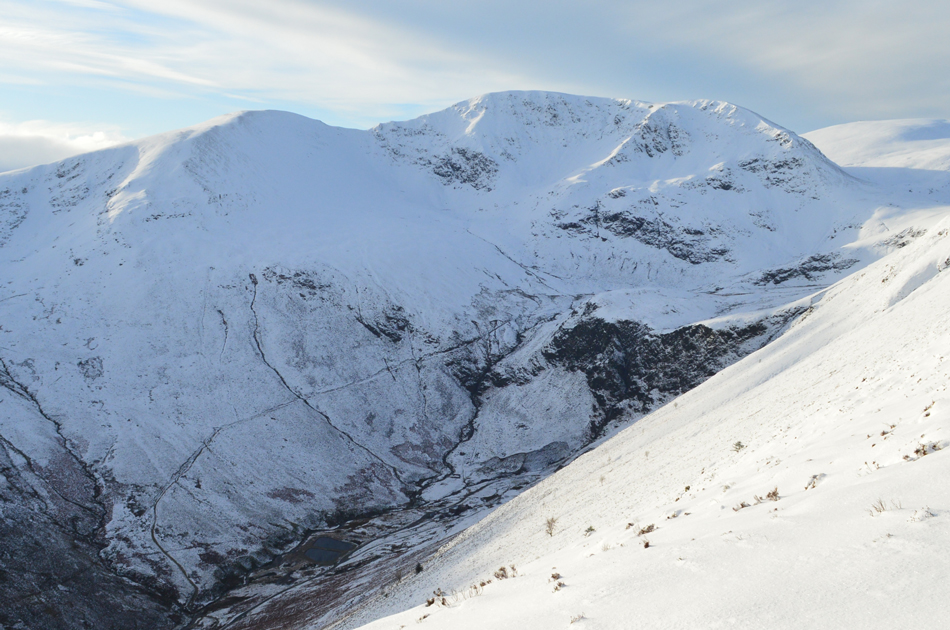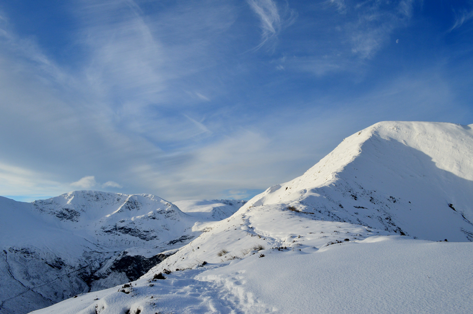 This image shows the path defined by snow running from right to left which we would use to descend back into Braithwaite by although we just didn't know it yet. |