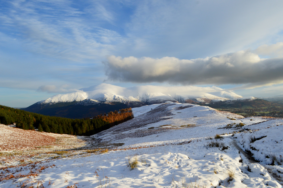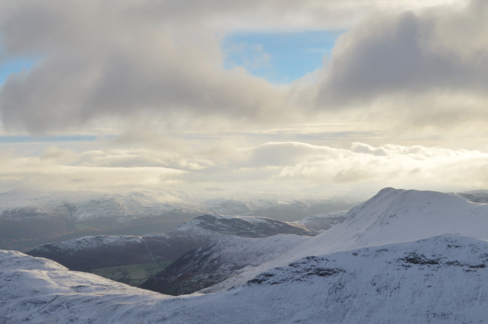 After ascending steeply from the car park and once through the plantation our views widened over the Skiddaw Fells which had a light covering of cloud which was also advancing on Blencathra which only half an hour ago, was cloud free. Further east more cloud clung to Clough Head and continued all the way along the eastern ridge enveloping Helvellyn so tightly the cloud was difficult to define from the snow.