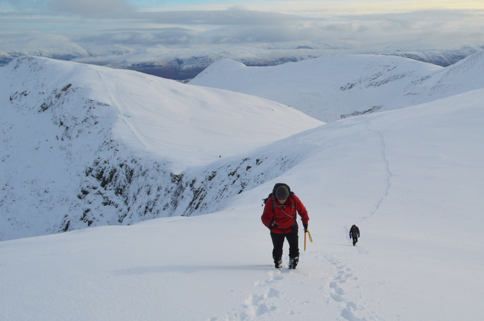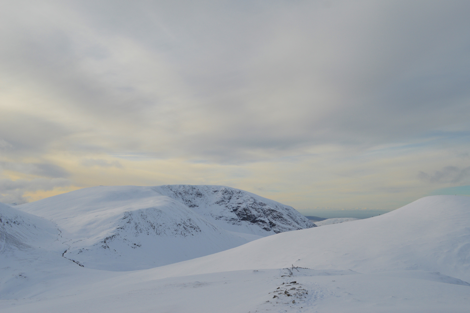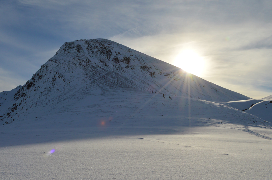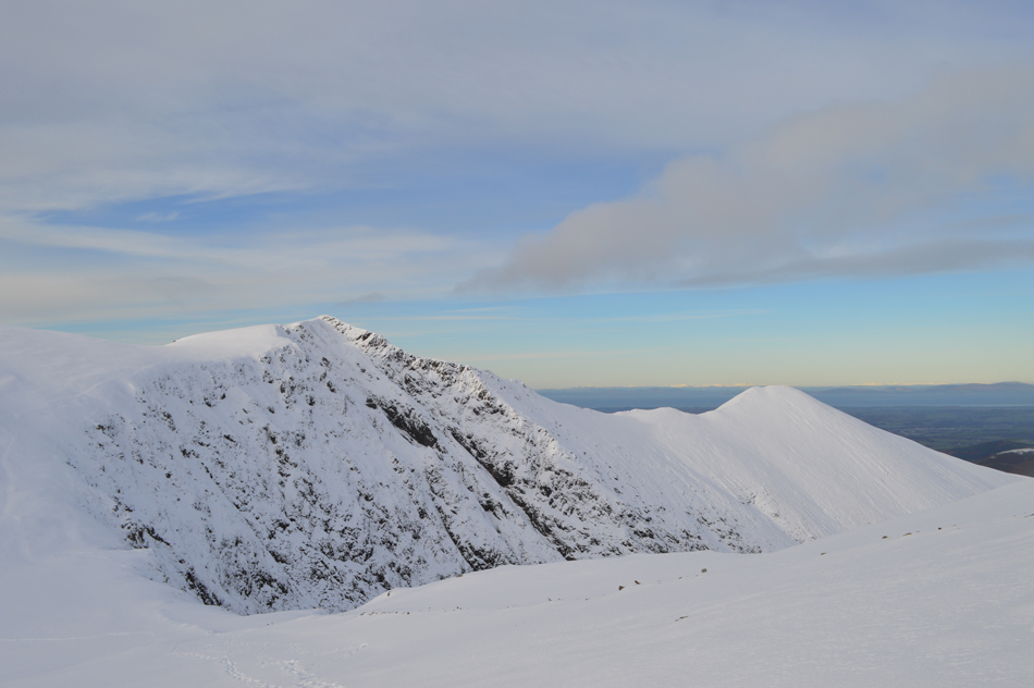 Gaining Kin from the car park always gets the lungs working and today was no different with the exception that we had snow underfoot almost from the start which had started to crust over which at least made the ascent that bit easier "we may need the spikes later said Andy" we'll just have to see how it progresses further up the ridge all the while watching the morning light develop over our surrounding summits. |