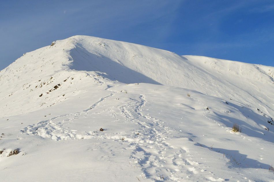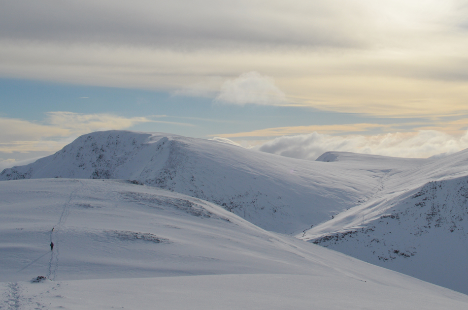 We didn't make the summit in any hurry instead stopping to chat or just soak up our views. Underfoot the snow had now turned to powder after leaving the firmer crustier snow lower down the ridge and we both agreed sometime during the early hours more snow mixed with hail would have fallen which meant that for now, the new snow on top of the old, was much easier to wade through.