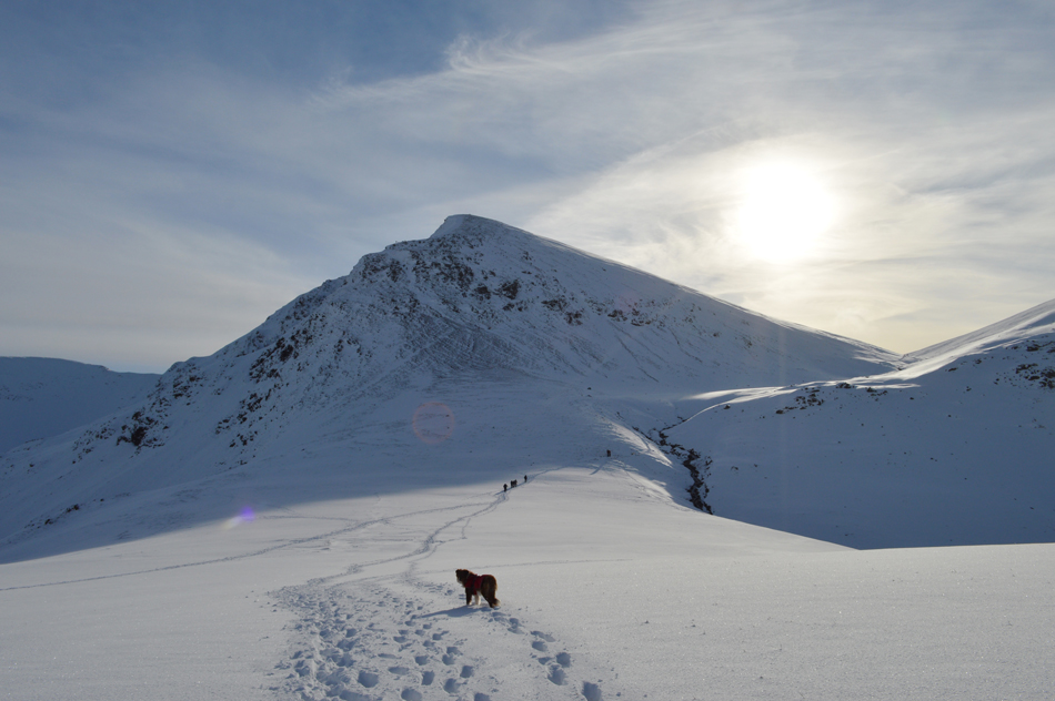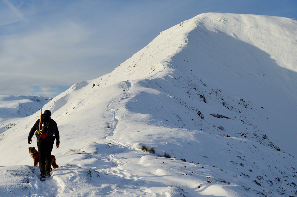 Despite the snow and conditions it was actually quite warm with a mild wind chill of around -1°C. It was during the ascent after assessing the varying snow depth did we agree to shorten the walk and enjoy it rather than hurry our way around the whole Horseshoe, I'm sure if Billy could talk he would have agreed too. |