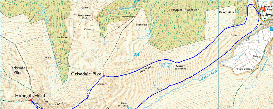 Whinlatter Pass - Kin - Sleet How - Grisdedale Pike - Hobcarton Crag - Hopegill Head - Sand Hill - Coledale Hause - Force Crag Mine - Mine Track Back To Whinlatter Pass |
