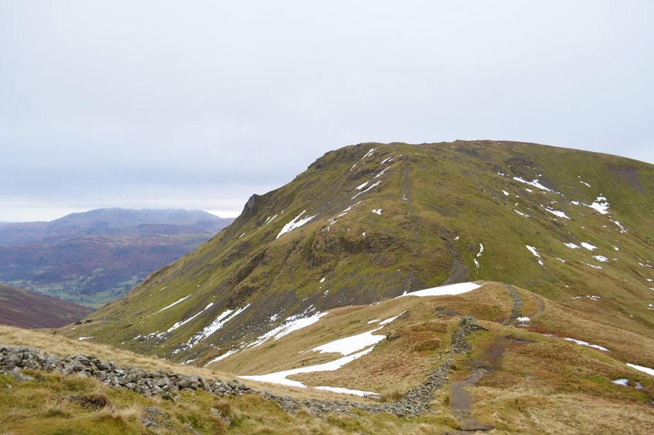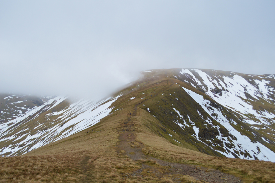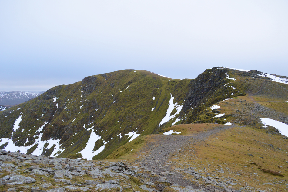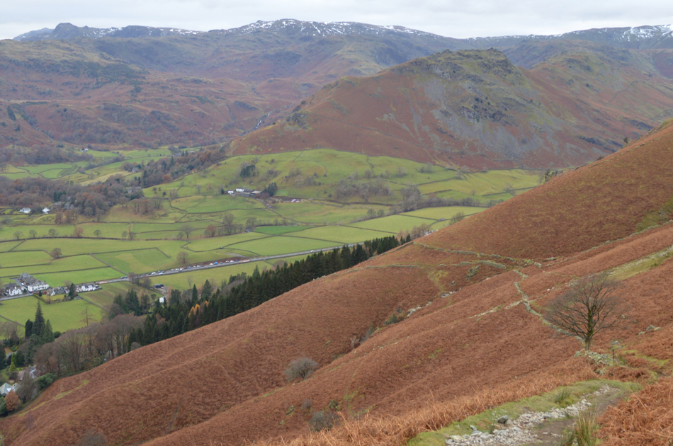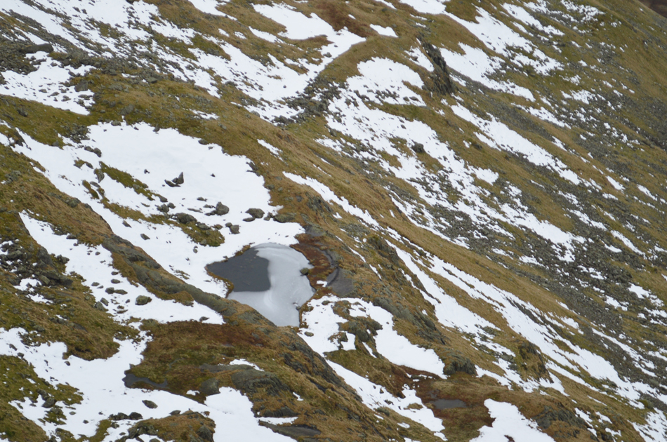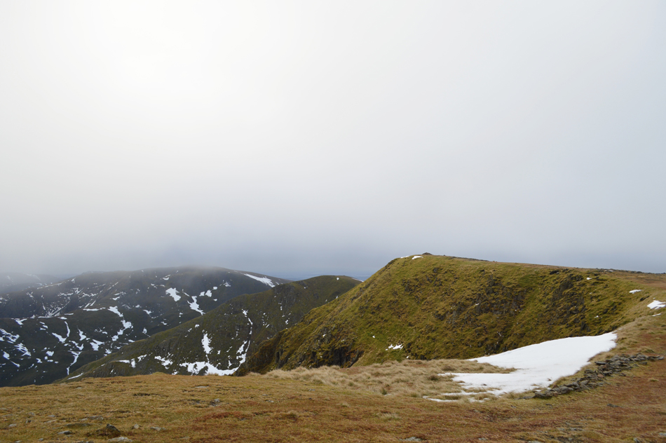 We soon arrived at an empty Swirls Car Park which is the same one where the familiar ice cream van used to park although this had become a distant memory since last December's storms. The thickest of the fog would appear to be confined to the Grasmere side of Dunmail leaving a coating of mist over St-Johns-in-the-Vale with clear views over Lonscale Fell and Skiddaw. Meanwhile behind us our route onto Browncove Crags would also appear to be clear as sparse snow patches could be seen higher up the slopes...it was at this point I untied my Ice Axe from my pack both agreeing we should leave our Crampons and Spikes packed just in case. Its pretty mild at 5°C without a breath of wind which left hats and gloves tucked away, well for now at least. David locks his car and we strike out over fresh tarmac and cross the road then through the new wooden gate into the second car park before crossing Helvellyn Gill via a narrow wooden footbridge...it was just up ahead l lost my phone, thankfully todays ascent on Browncove Crags wont be with my heart in my mouth. |