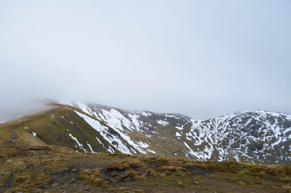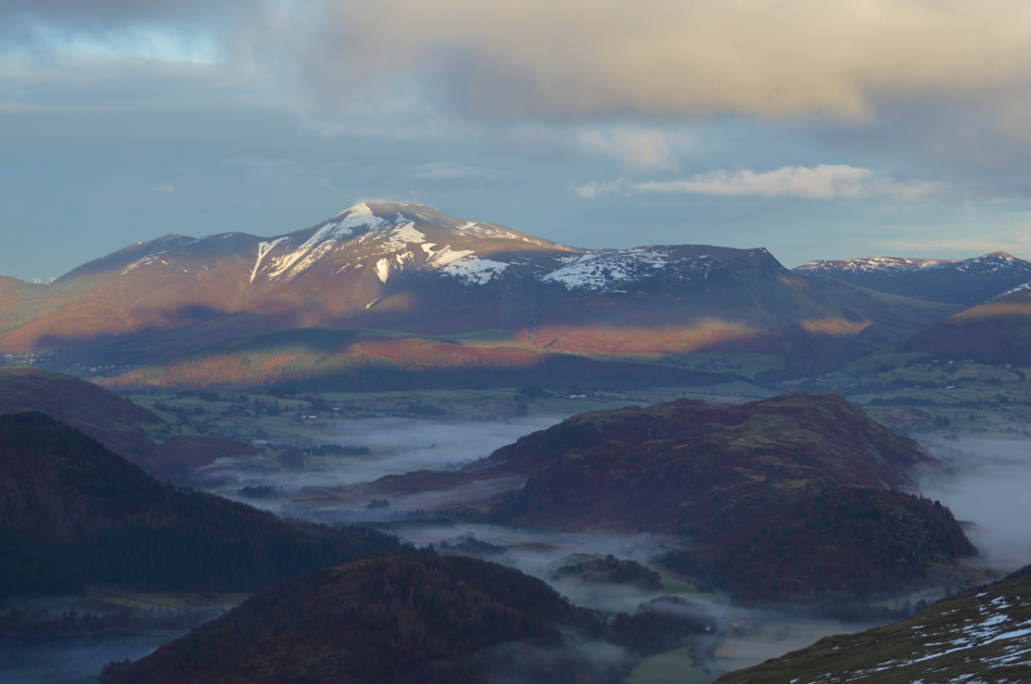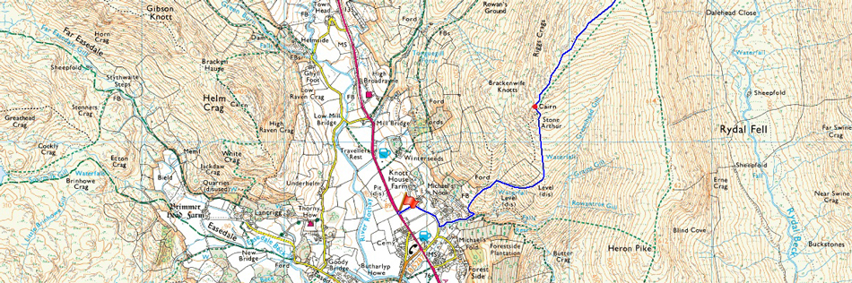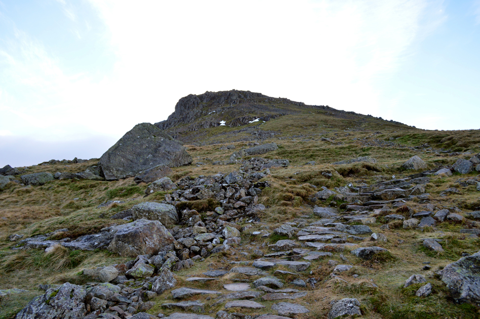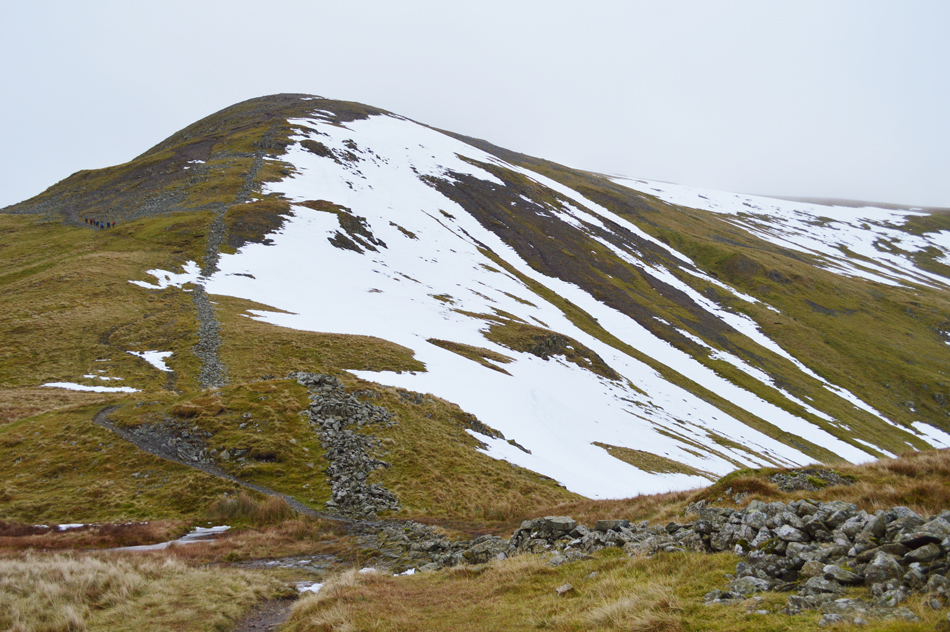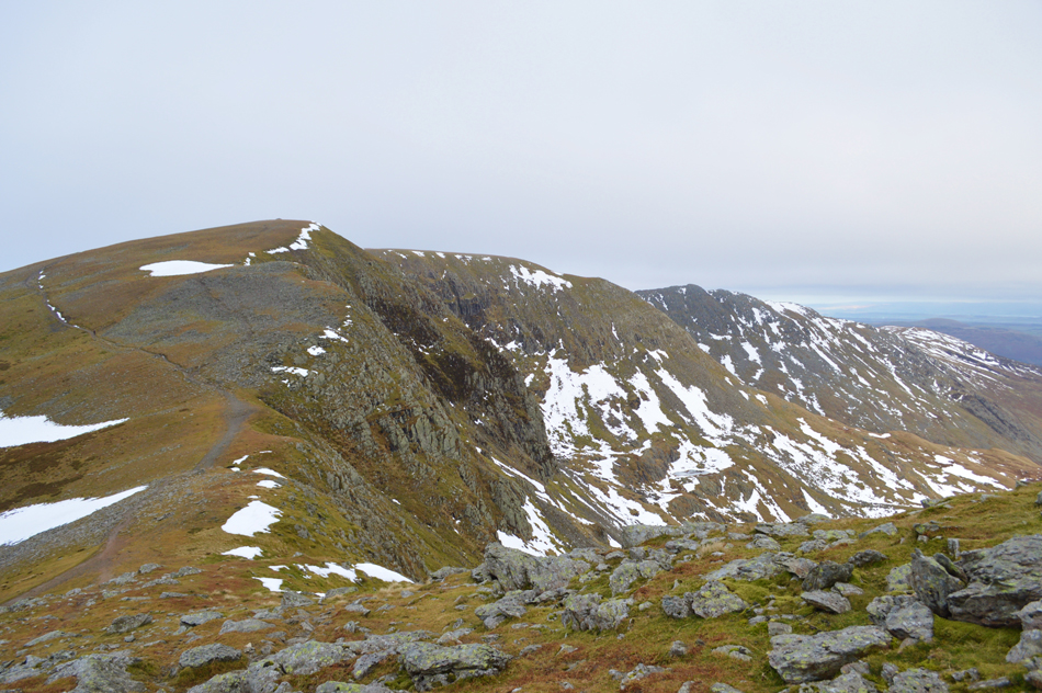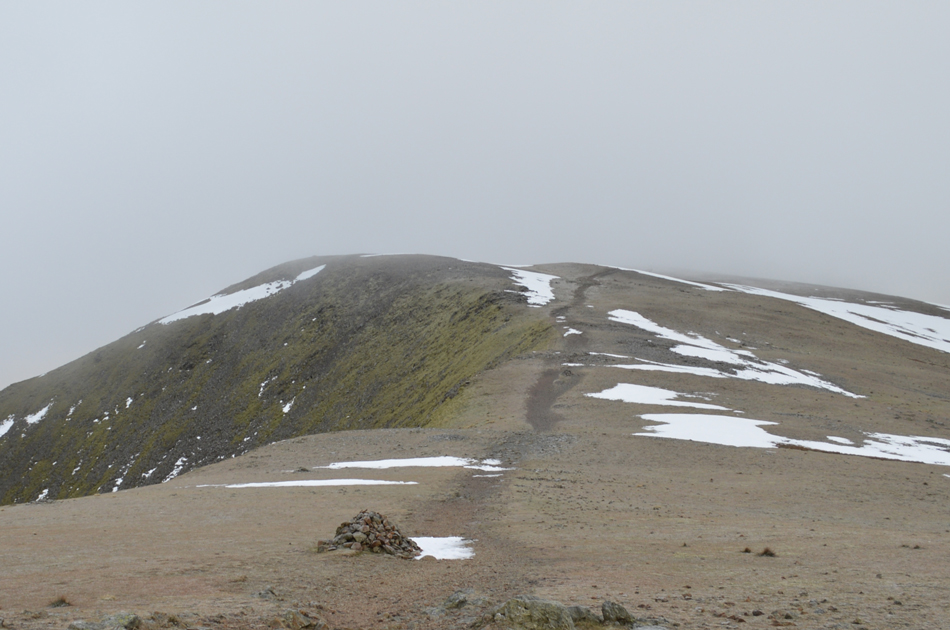 We soon arrived at an empty Swirls Car Park which is the same one where the familiar ice cream van used to park although this had become a distant memory since last December's storms. The thickest of the fog would appear to be confined to the Grasmere side of Dunmail leaving a coating of mist over St-Johns-in-the-Vale with clear views over Lonscale Fell and Skiddaw. Meanwhile behind us our route onto Browncove Crags would also appear to be clear as sparse snow patches could be seen higher up the slopes...it was at this point I untied my Ice Axe from my pack both agreeing we should leave our Crampons and Spikes packed just in case. Its pretty mild at 5°C without a breath of wind which left hats and gloves tucked away, well for now at least. David locks his car and we strike out over fresh tarmac and cross the road then through the new wooden gate into the second car park before crossing Helvellyn Gill via a narrow wooden footbridge...it was just up ahead l lost my phone, thankfully todays ascent on Browncove Crags wont be with my heart in my mouth. |