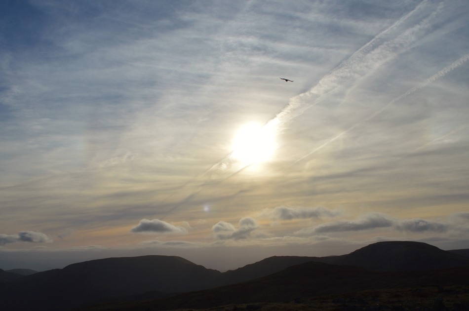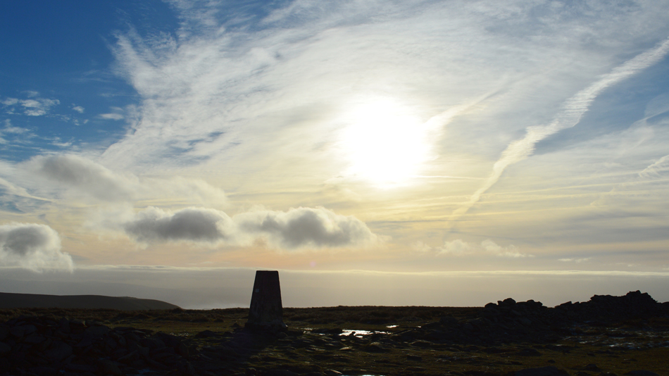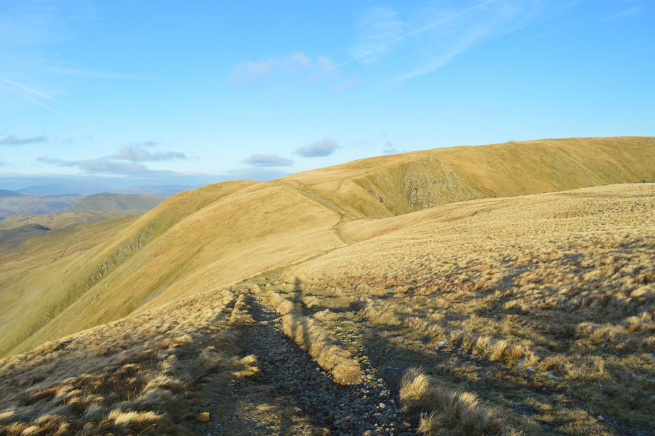 With quite a short lunch break I re-shouldered my pack and started to retrace my route towards Kidsty Pike which by now was directly below a Winter sun, the light had faded through a mix of cloud but mostly haze which had descended during my down time, the camera makes it look much darker than it actually was when in fact it was quite dramatic walking towards my last summit with the silhouette of High Street and Harter Fell in the distance. |