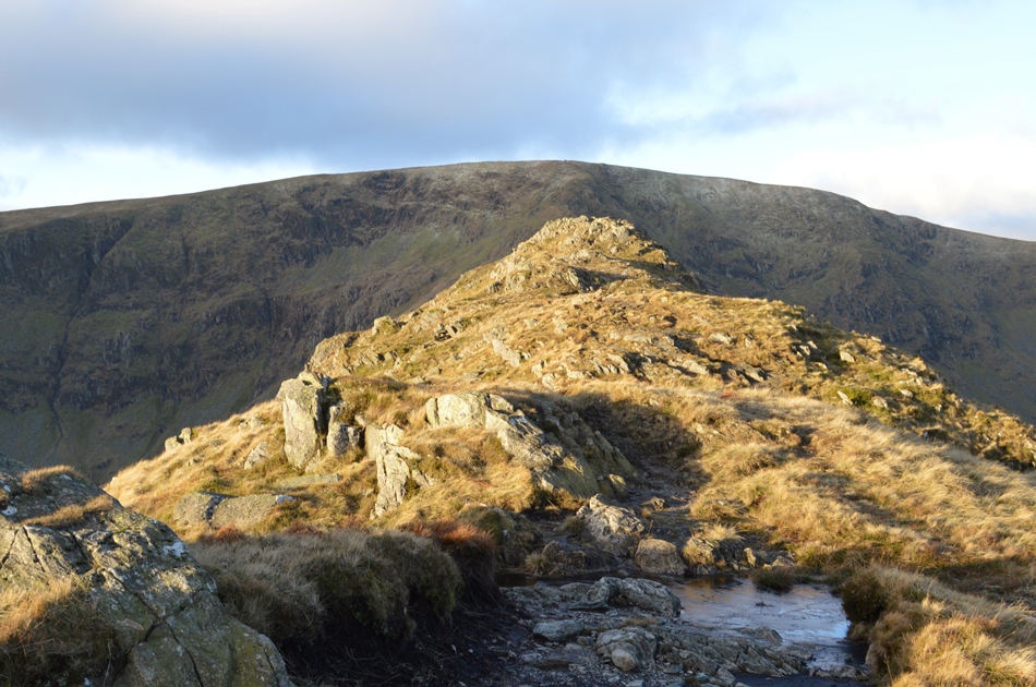 The summit of Rough Crag is just up ahead now, while beyond the final pull via Long Stile and eastern headwall of High Street forming the Straights of Riggindale over on the right. |
