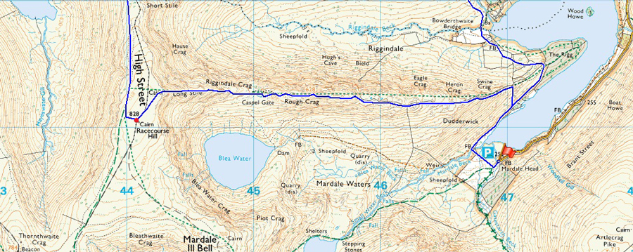 Mardale Head - Rough Crag - Caspel Gate Tarn - Long Stile - High Street - Straights of Riggindale - The Knott - Rampsgill Head - High Raise - Kidsty Pike - Kidsty Howes - Riggindale Beck - The Rigg - Mardale Head |