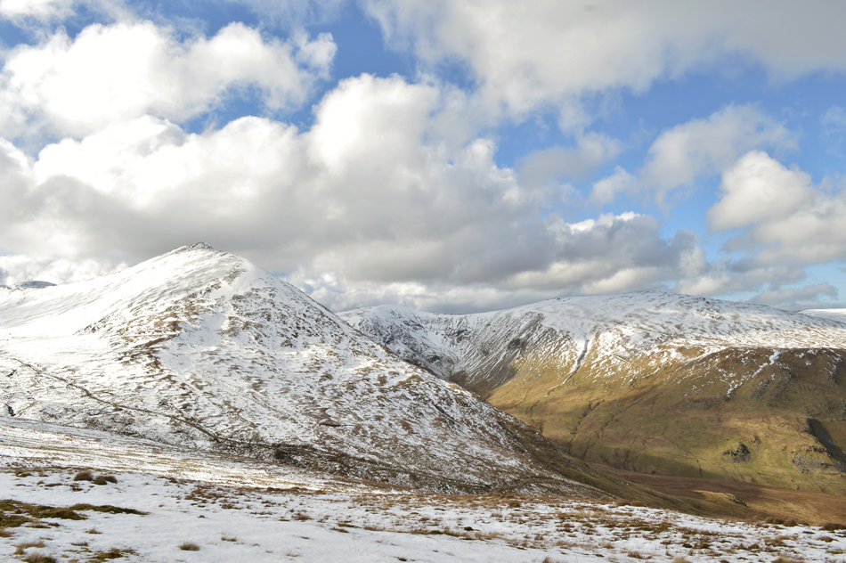 Walkers with red blood in their veins should give their attention to the north west ridge. This looks formidable (from White Side it looks impossible) but is actually an easy uphill walk without any difficulty other than steepness. |