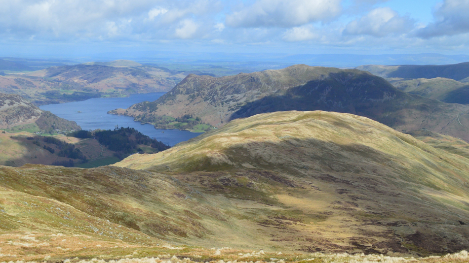 Descending St Sunday Crag with views over Birks, Place Fell, Gowbarrow Fell and Ullswater. |