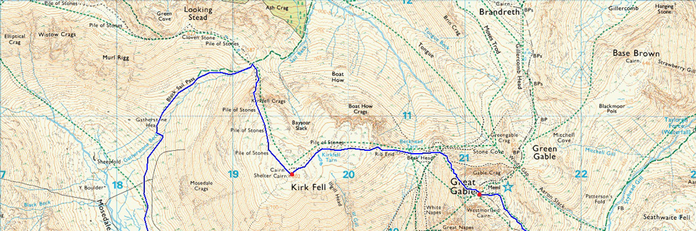 Wasdale Head - Lingmell Gill - Brown Tongue - Mickledore - Scafell Pike - Lingmell Col - Lingmell - Lingmell Col - Corridor Route - Sty Head - Great Gable - Beck Head - Rib End - Kirk Fell - Kirkfell Crags - Top of Blacksail Pass - Gatherstone Beck - Mosedale - Mosedale Beck - Wasdale Head |