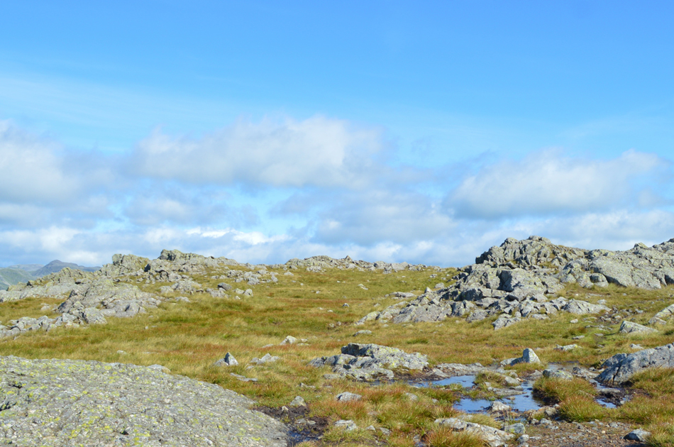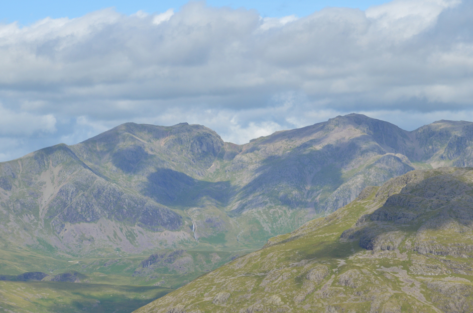 The Scafell Group seen with the Langdale Pikes as I head over the Top of Broad Slack towards Great Carrs summit. |