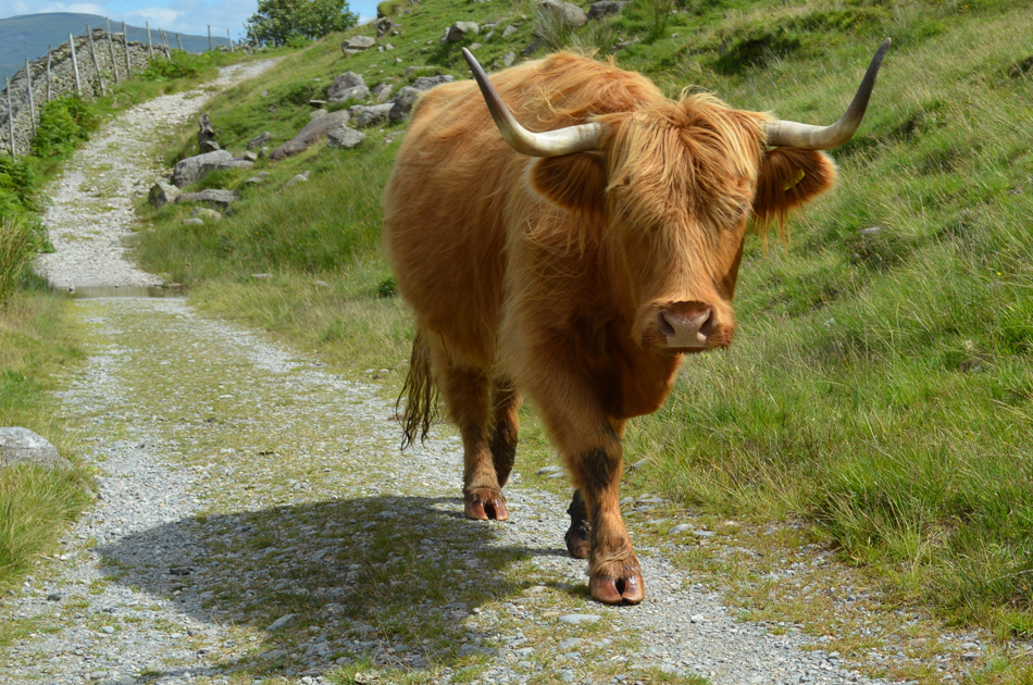 Up ahead, a herd of yellow and red Highland Cows graze just away from the path which told me they were probably domesticated and are used to people walking by. |