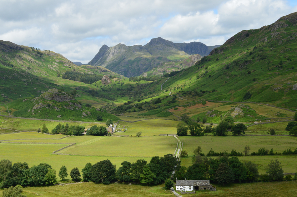 The Langdale Pikes seen over Little Langdale. |