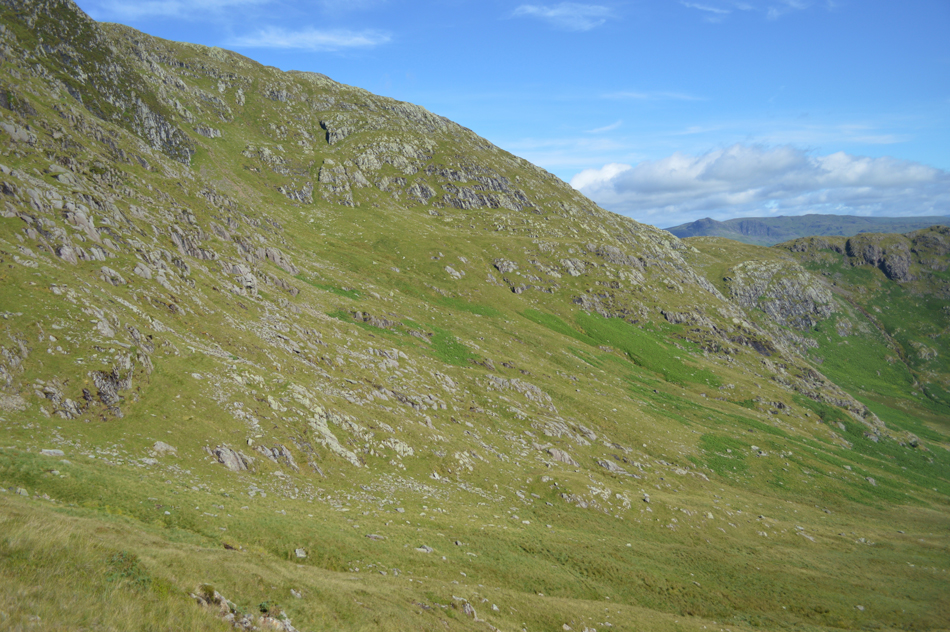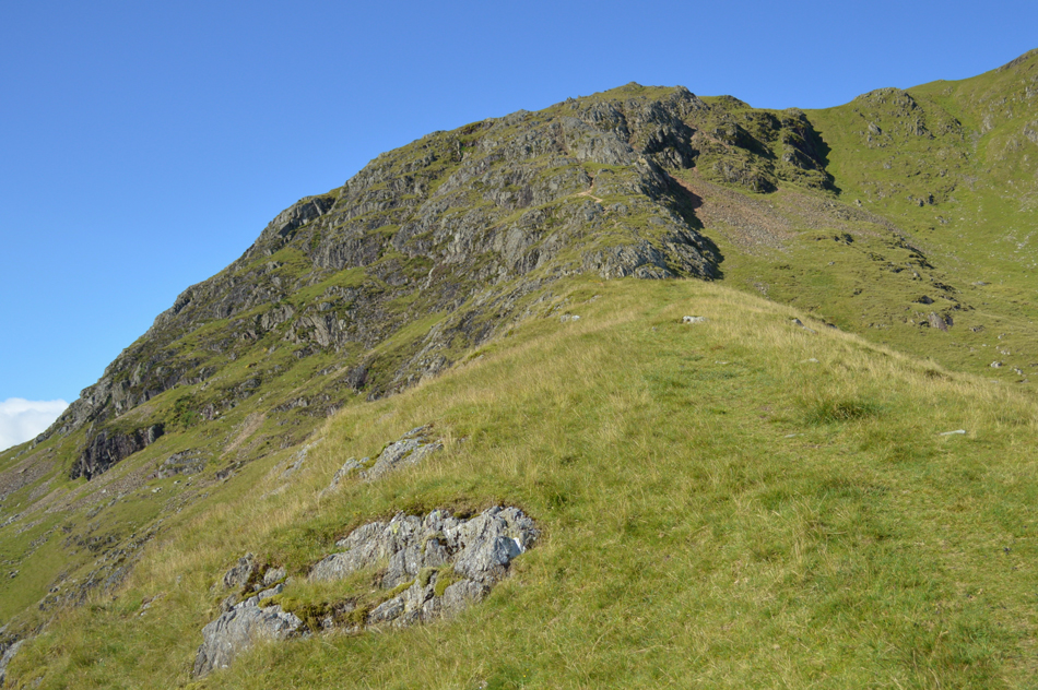 From the base of Steel Edge a steady grassy ascent over the lower slopes is required before getting into the nitty gritty of the crags up ahead. |