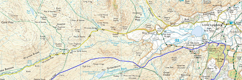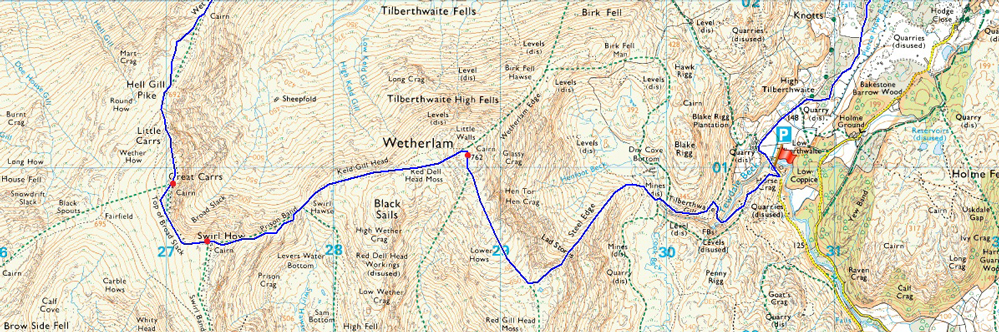 Tilberthwaite – Above Tilberthwaite Gill – Dry Cove Bottom – Steel Edge – Wetherlam – Prison Band – Swirl How – Top Of Broad Slack – Great Carrs – - Wet Side Edge – Greenburn Beck – Slater Bridge (Little Langdale) – Cathedral Quarry – Moss Rigg Wood – Pierce How Beck – Tilberthwaite |
