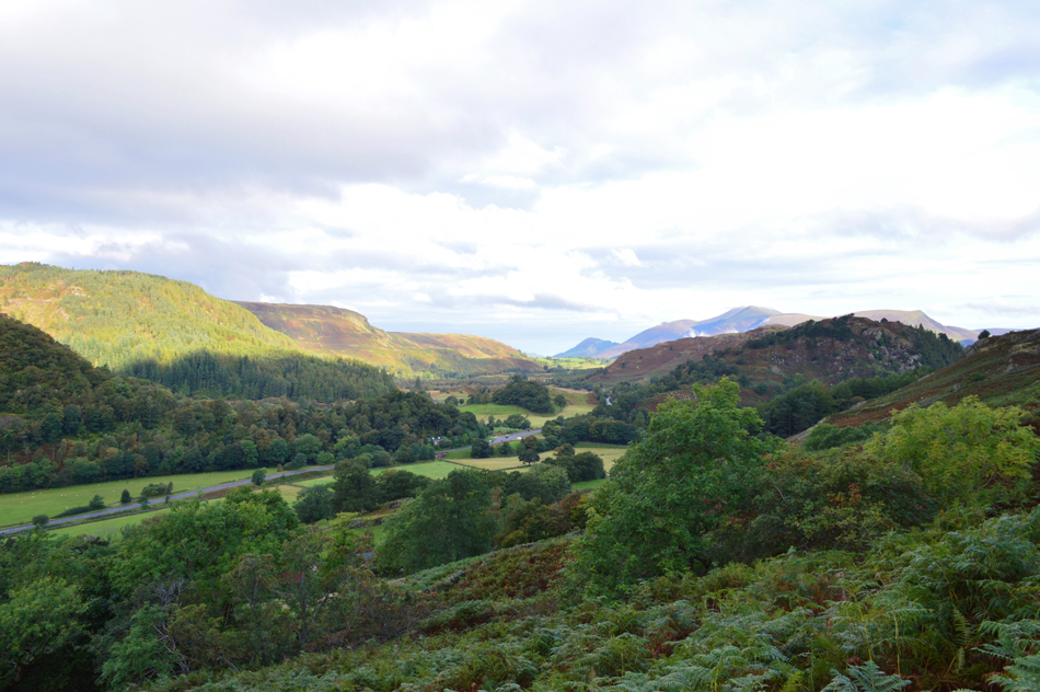 Looking back over Legburthwaite towards Brown How, High Rigg, Dodd Crag and a distant Skiddaw from Sticks Pass. |