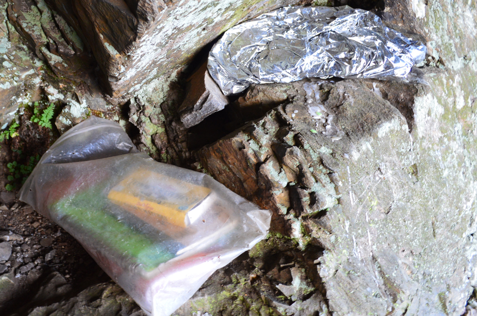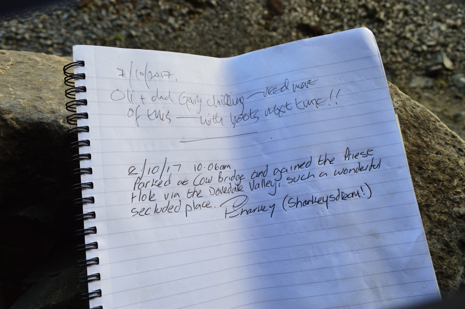 The cave was just as I had remembered, tidier even with no litter just a thin plastic mat on the cave floor which appears to be some type of base sheet. In the cave I found three visitor books alongside a large box of matches wrapped up inside a see-through plastic bag, all three books were damp so I grabbed the largest and driest of the books, turned to an empty page and set about writing my thoughts down. |