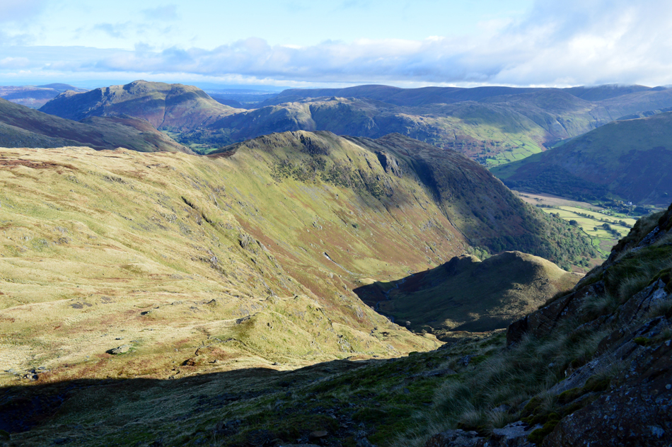 The commanding view over Black Brow towards Dove Crag, Stang Crags, Hartsop above How and St Sunday Crag from Little Hart Crag. |