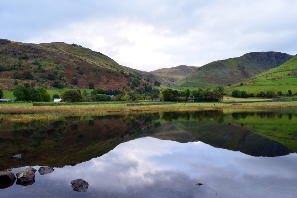 I pulled into the car park at Cow Bridge and tucked the front end of the car facing Goldrill Beck, two other cars looked like they had been there all night, both had parked side on taking the space of four cars, there's no point in hiding it, this really annoys me. The rain had eased away but it was still pretty damp underfoot and the sound of a pretty full Goldrill Beck filled my ears as I kitted up. I'm not sure if we have many 'shorts' days left but I reckon today would have been one of them had I have known how warm it was about to turn out but for now I'll follow the forecasters advice and wear long trousers just in case I'm caught out in any showers. With my car locked I pass through the gate and head towards Brothers Water before dropping down towards the shoreline, even in the low light the surface of the water was so still and I spent a few moments drawing in the morning air while taking in the wonderful views. |