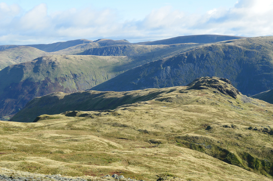 Little Hart Crag and High Hartsop Dodd seen over Bakestones Moss from High Bakestones Cairn. |