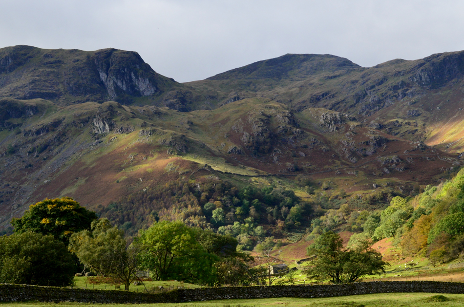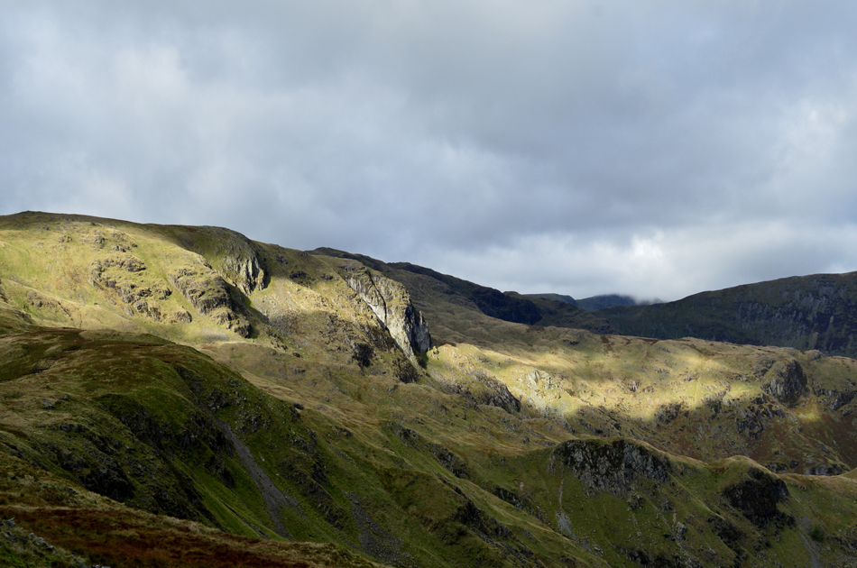 Dove Crag seen over Stangs enjoying a spell of sunlight. |