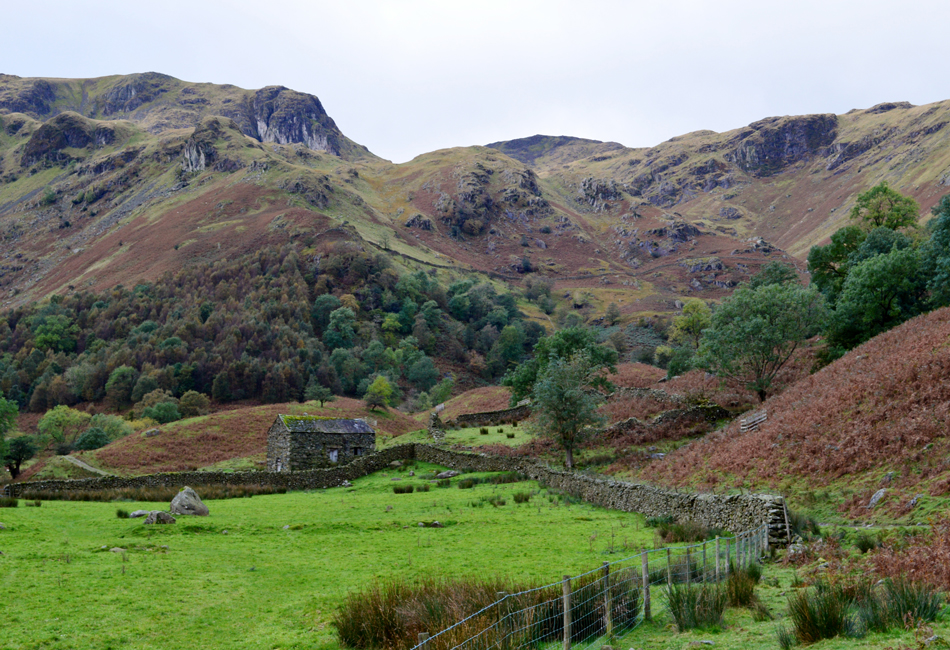 More walkers are passed during those last few hundred feet of descent all of whom in great spirits before passing by the old barn at the foot of High Hartsop Dodd north east ridge, once through the barn I stride through open farmland towards Hartsop Hall passing dozing cattle who don't even batter an eyelid as I pass by. My view into Dovedale valley is the most striking of the day and far below Dove Crag, I spot movement but I can only make out the colours of the walkers jackets. |