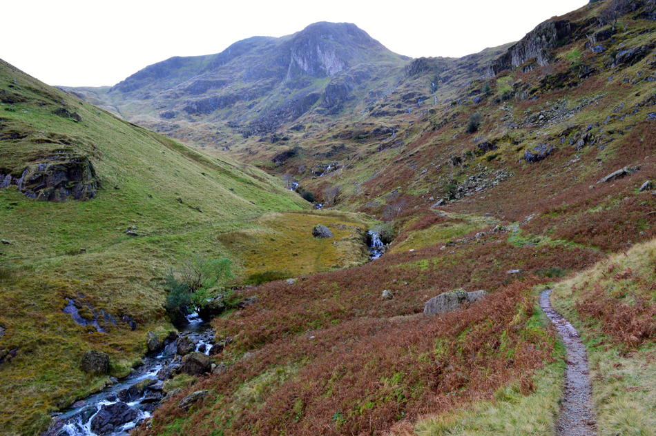 After crossing Dovedale Beck for the first time back at the valley floor the steady ascent began alongside Dovedale Beck where at times I had no option than to give the path a wide berth if only to avoid the bogs and standing water. Nearby the sound of Dovedale Falls began to dominate my ascent and remained to do so for the duration until I reached a stone wall which ran across the fell side horizontally (see previous photo) it was here, or not long after I would cross Dovedale Beck for the second time via a new wooden bridge, its nails still as shiny as if they had been nailed in yesterday. Here I studied the path mainly because the path that I was to continue on was flowing with water and I could see another path on the other side of the beck which must lead directly into Hunsett Cove, I consult my map and confirm that I keep to the right of the beck even it means walking through flowing water, up ahead the path emerges while on the flank of The Stangs, with Dove Crag and the last push towards its summit. |