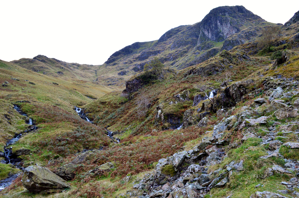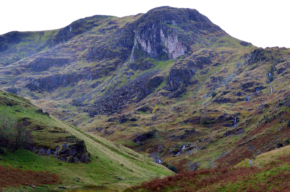The new wooden bridge was always in sight behind me and at times it didn't seem to be getting any further away. Two sheep accompanied part of my ascent who just nipped on up ahead until I was within five or six feet away and repeated until they too reached the base of the gully before they disappeared through the bracken and watched as I walked by. I couldn't but help compare my surroundings to those when I was last in Pillar Cove beneath Pillar Rock, there too I was surrounded by flowing water and the dominance of huge rock cliffs above my head, Dove Crag felt very similar and just as appetising. |