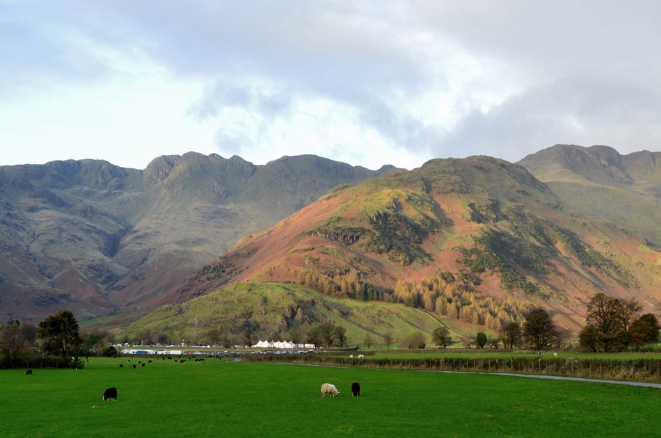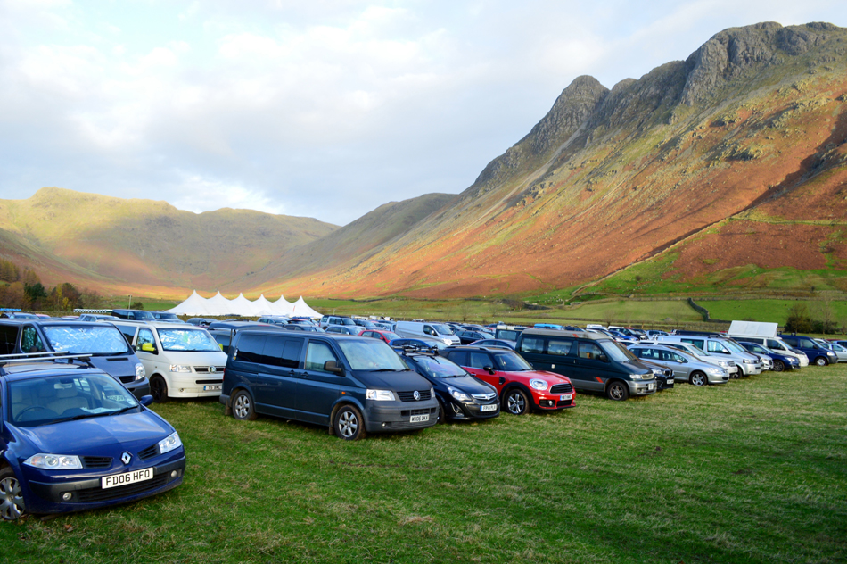 And lets hope so eh, here more cars are parked on the Mickleden side of Stool End Farm which just goes to show how popular the 50th Anniversary Fell Race is. The start and finish line is close to the white tents with Rossett Pike in the distance and Pike O'Stickle over on the right. |