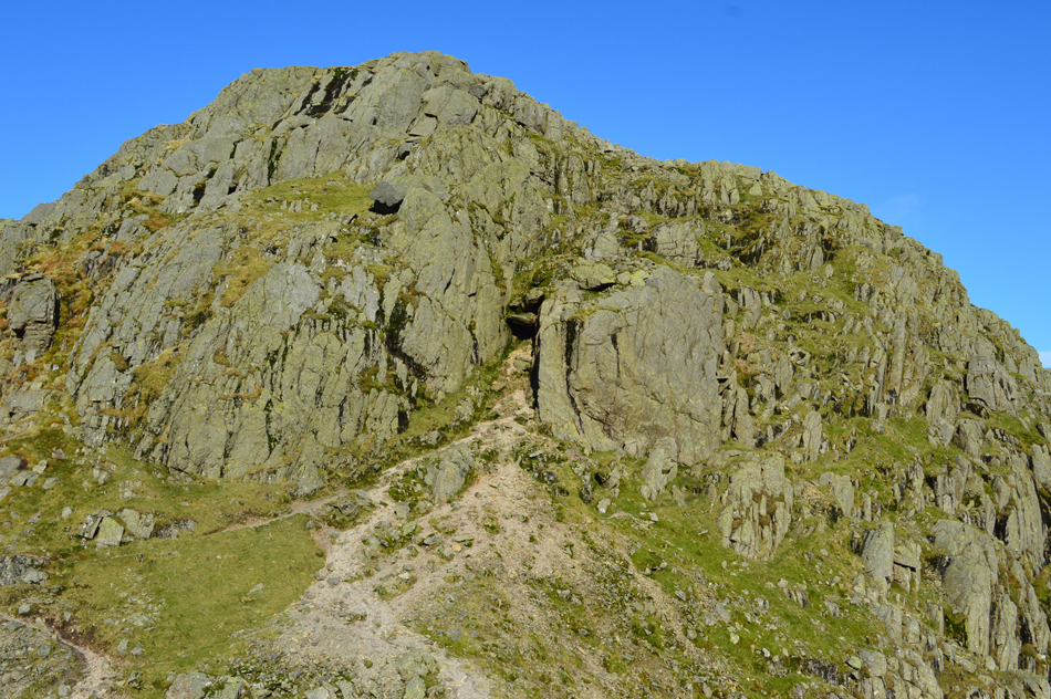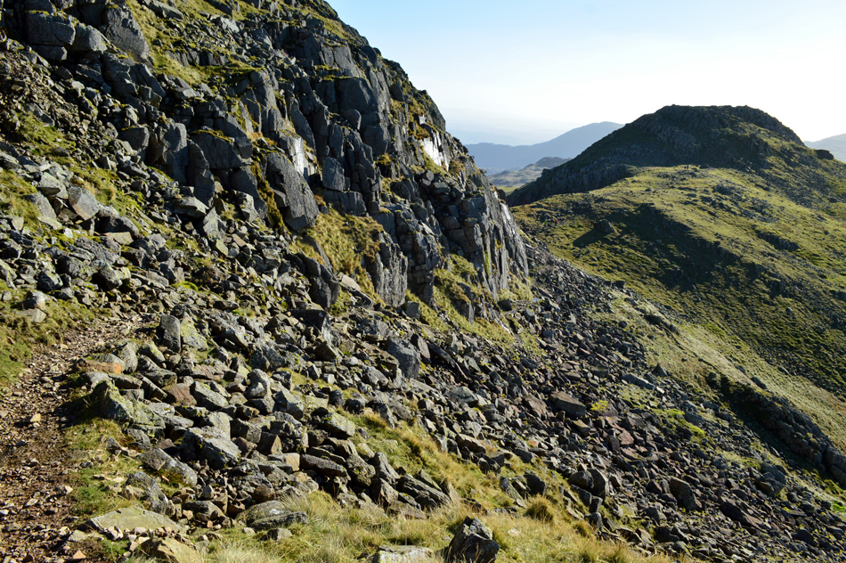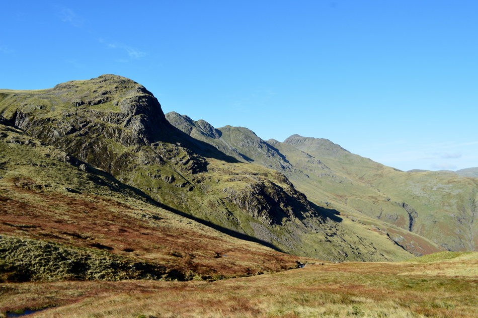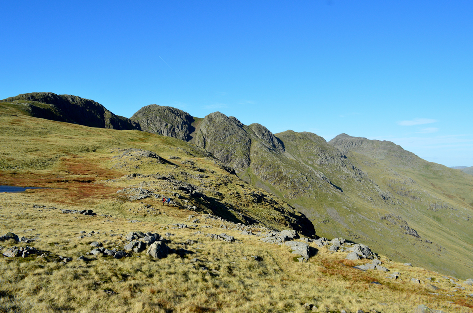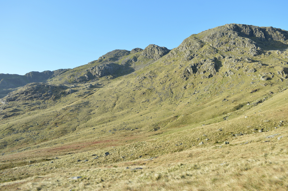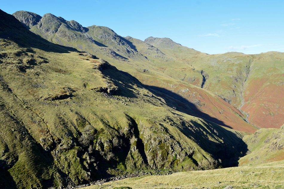 Crinkle Crags and Bowfell now seen over Great Cove. |