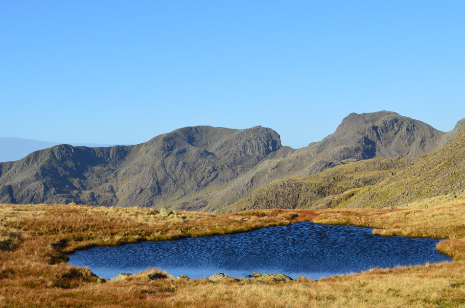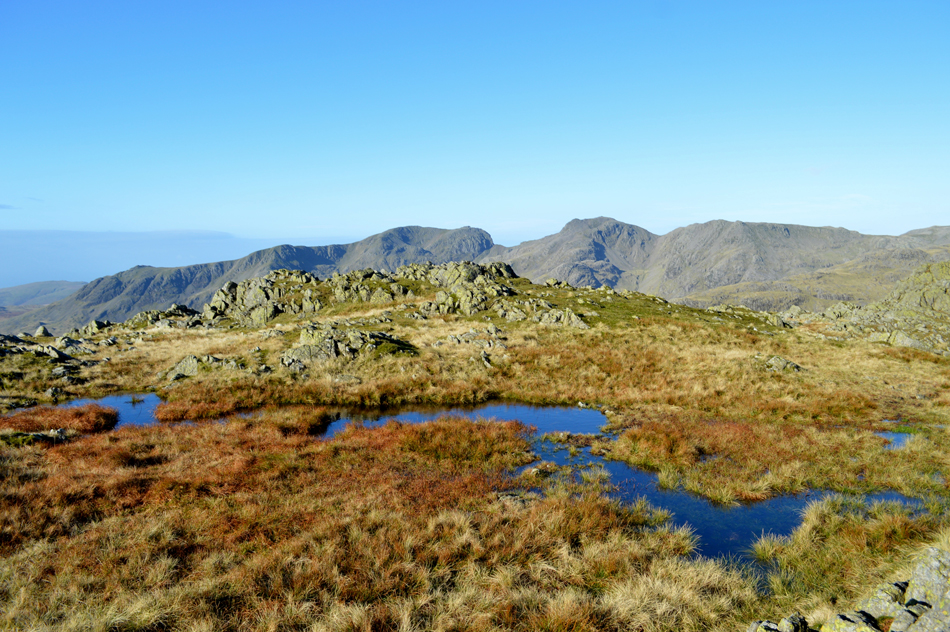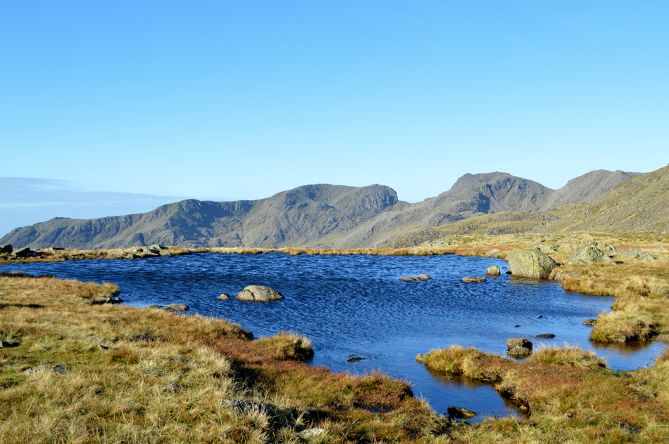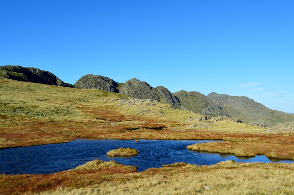 Crinkle Crags and Bowfell taken from the tarn below Great Knott summit. |