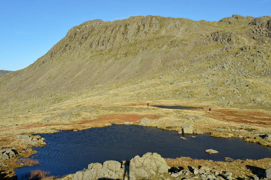 Three Tarns was as busy as I had expected and the views over towards the Scafells were as clear as I'd ever seen them, the wind nipped at the end of my fingers and the tips of my ears and before long I knew I'd have to put my jacket back on and even add my hat and gloves. I spot walkers shoulder from the Lingcove Beck side of Three Tarns most of whom are wearing shorts but otherwise layered wisely. |