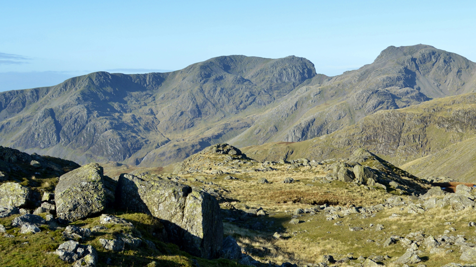 A close up of Sca Fell, Broad Stand, Mickledore, Scafell Pike, Rough Crag and Pen seen over Pike de Bield. |