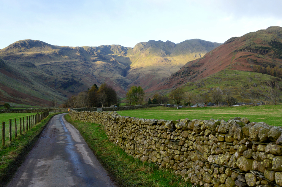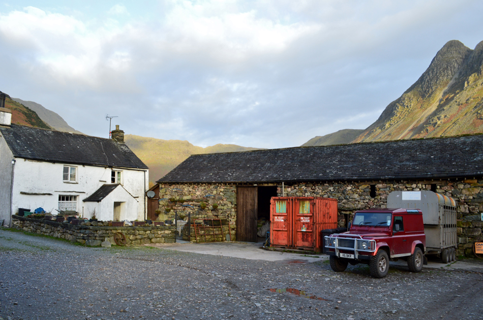 Passing through Stool End Farm with Rossett Pike on the left and Pike O'Stickle above the barn on the right. |