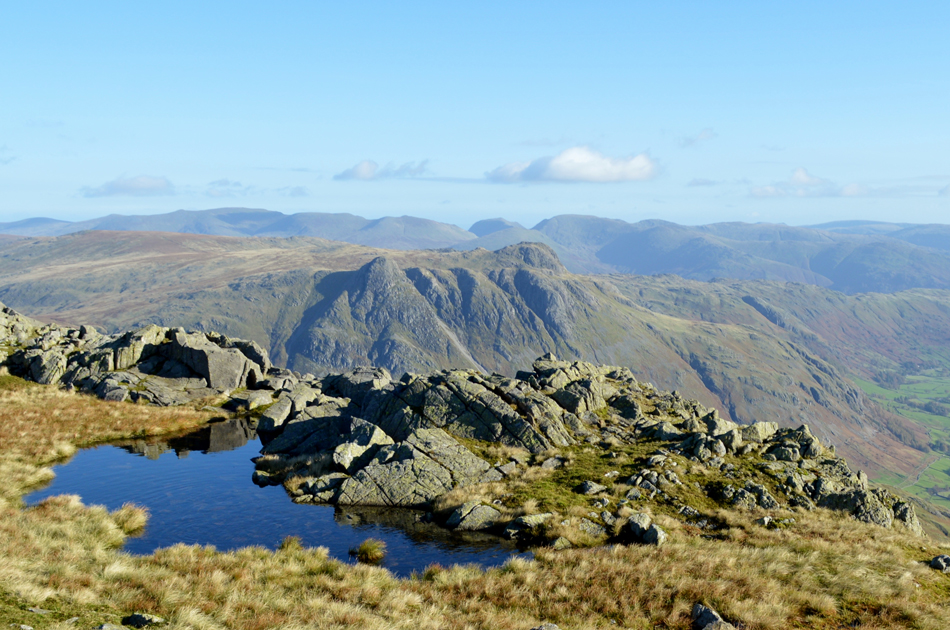A small pool provides the foreground to a grand view over towards the Langdale Pikes with the Helvellyn range clearly beyond. |