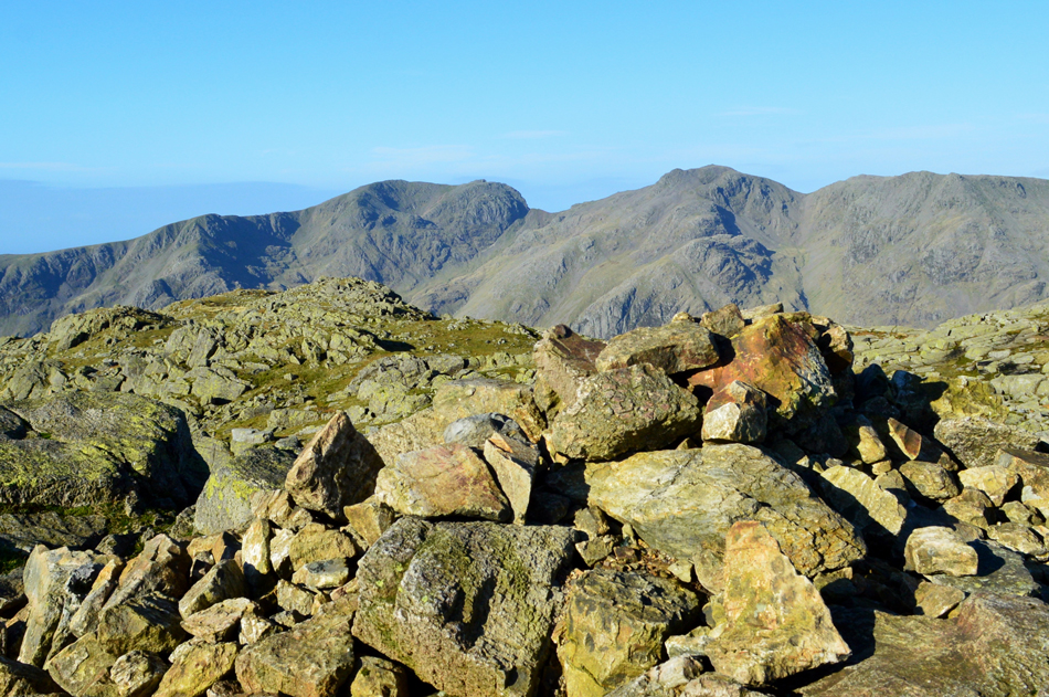 Slight Side, Sca Fell, Scafell Pike, Pen, Rough Crag, Mickledore, Broad Crag and III Crag from Crinkle Crags summit cairn. |