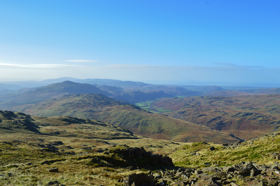 Distant views over Adam-a-Cove towards Hard Knott and Harter Fell (Eskdale) with Black Combe in the distance. |