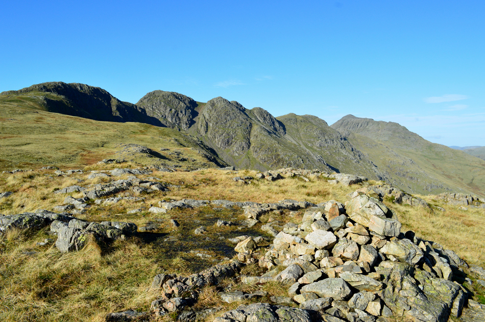 Looking back on The Scafells, Broad Crag, III Crag, Great End, Esk Pike and Bowfell. |