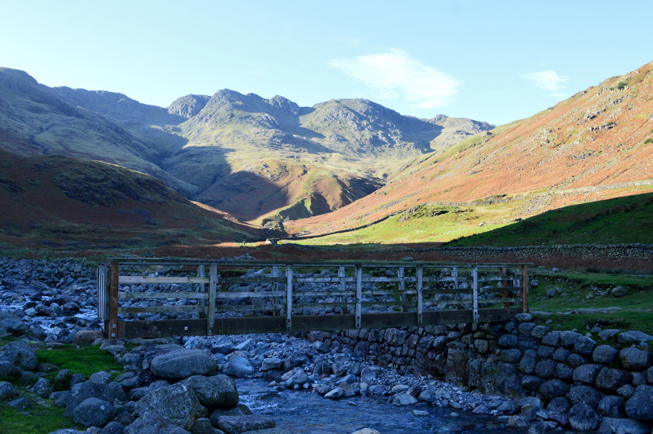 Crinkle Crags from the foot bridge over Oxendale Beck. |