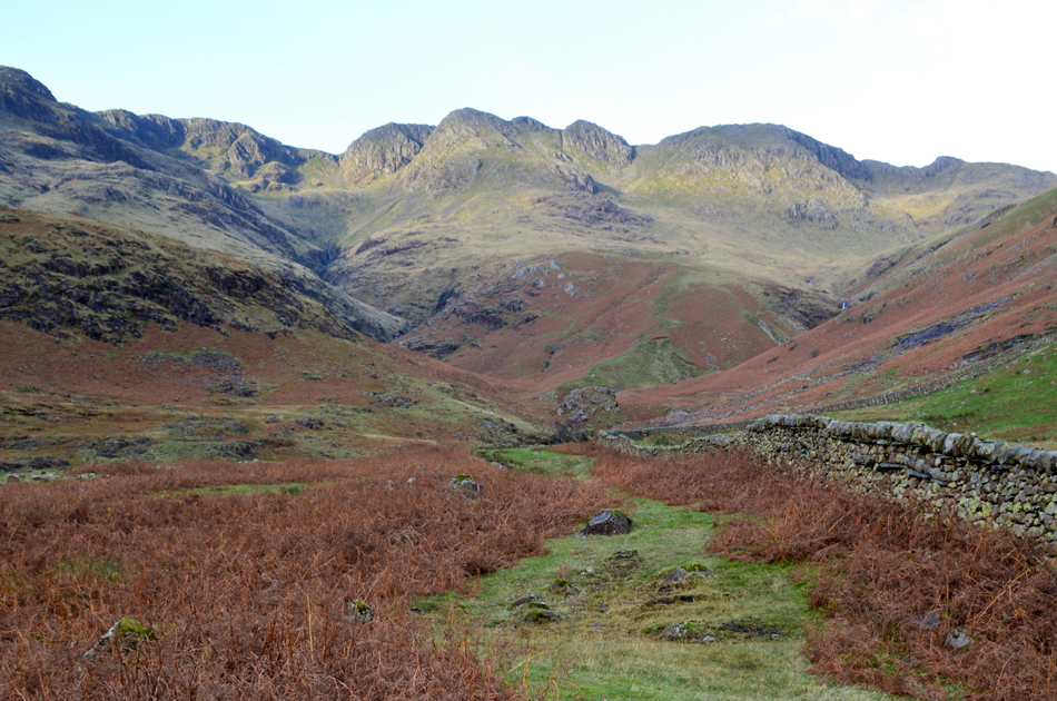 Great Knott, Crinkle Crags and Bowfell seen at the head of the Oxendale Valley. |
