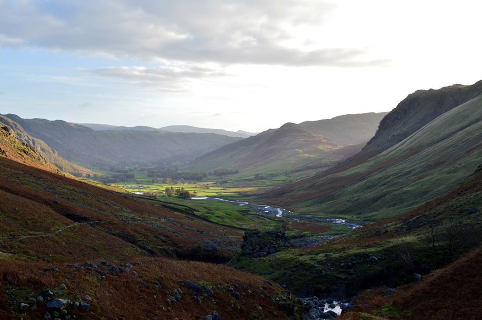 Looking back into the heart of Great Langdale towards Blea Rigg, Silver How, Side Pike, Lingmoor Fell and Wrynose Fell. |