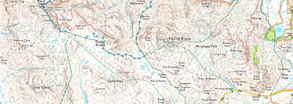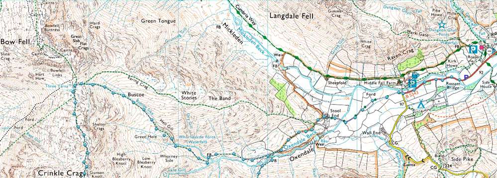 Rossett Bridge - ODG - Stool End Farm - Oxendale - Hell Gill - Buscoe Syke - Three Tarns - Crinkle Crags - Great Knott - Red Tarn - Browney Gill - Oxendale - Stool End Farm - ODG - Rossett Bridge |