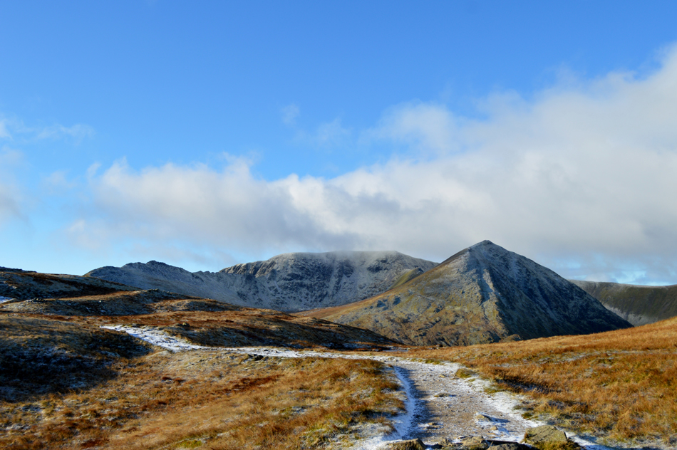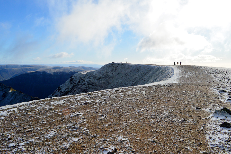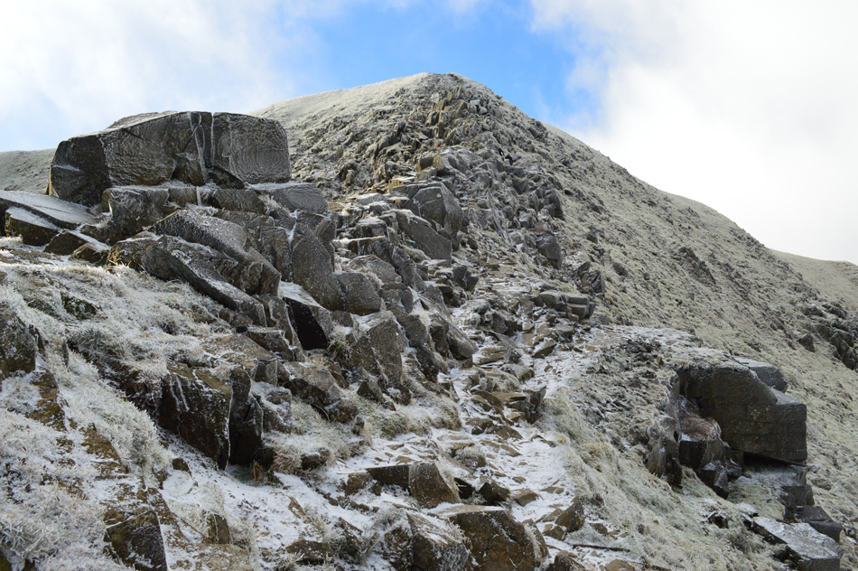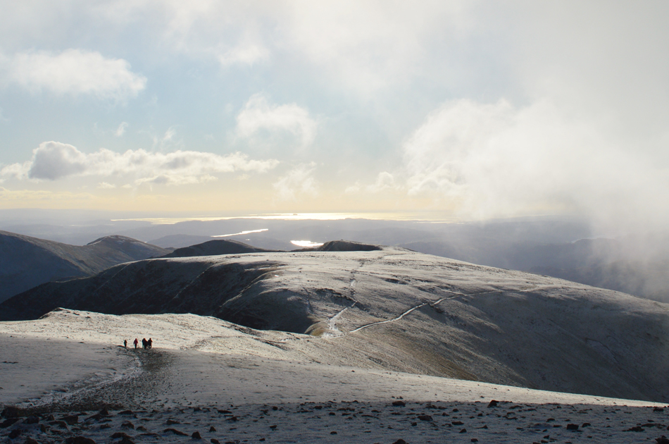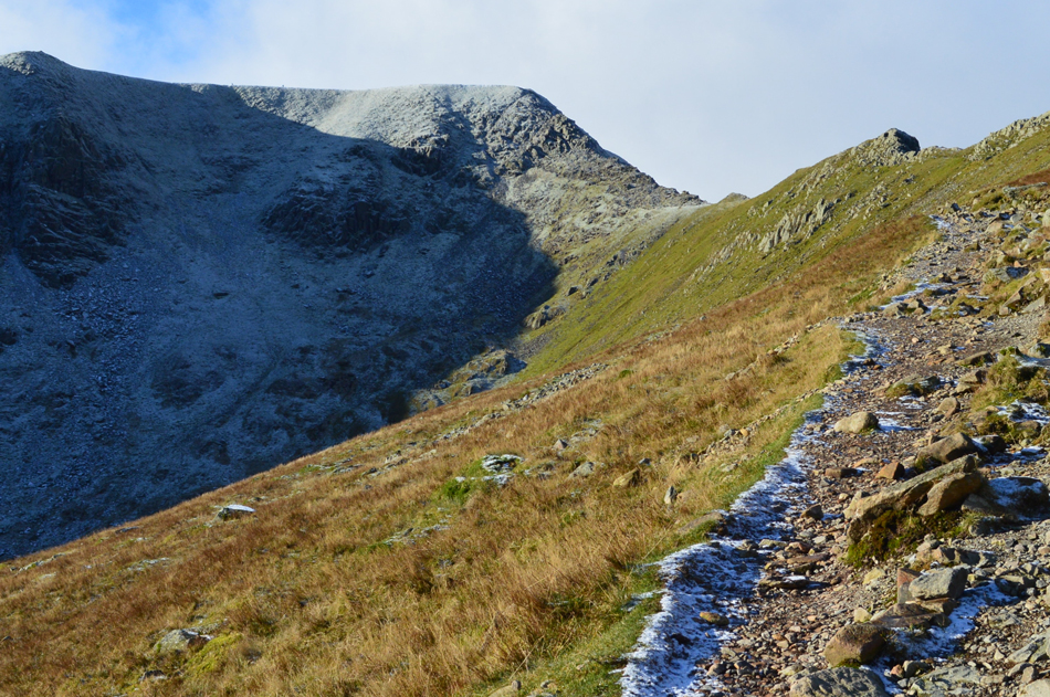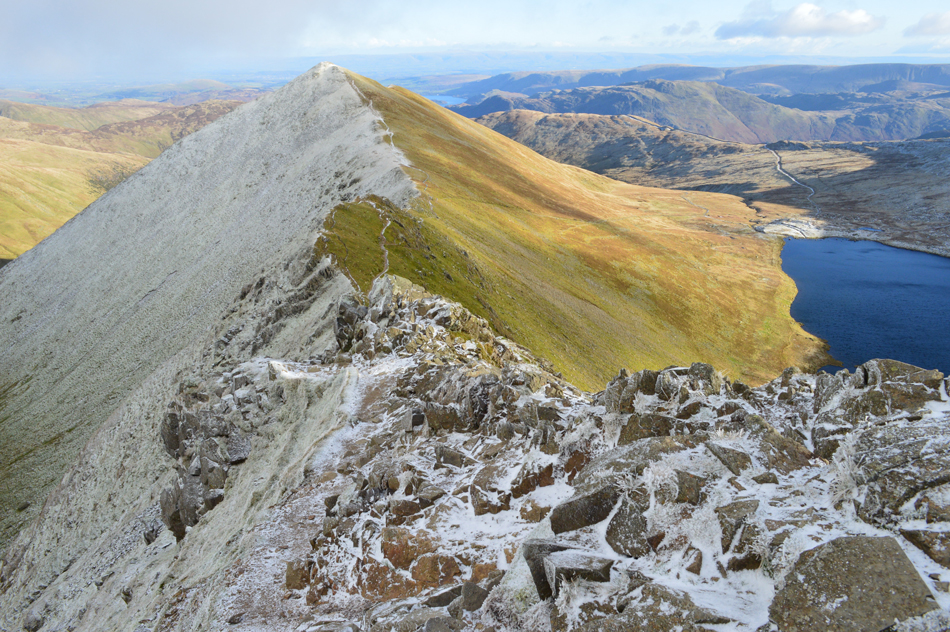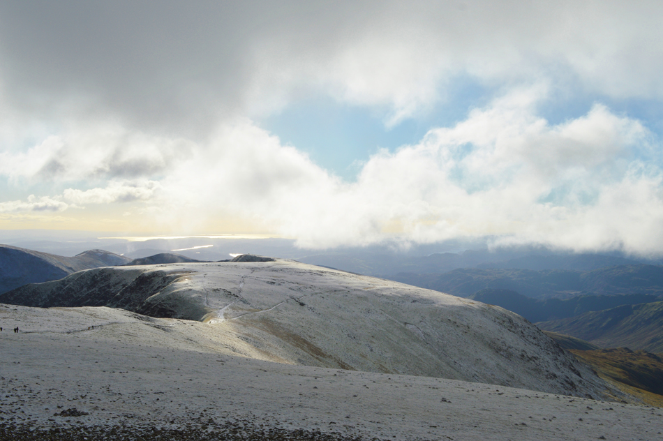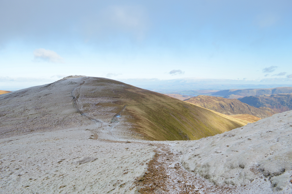 We hit a dusting of snow at around 2,100 ft which gathered along the edges of the path which progressively broadened across Birkhouse Moor's grassy plateau, it was just a dusting and nothing too substantial but it was still nice to see (and feel) the cusp of Winter on the Lakeland fells. We walked side by side before the drone of the wind started to cancel out conversation.