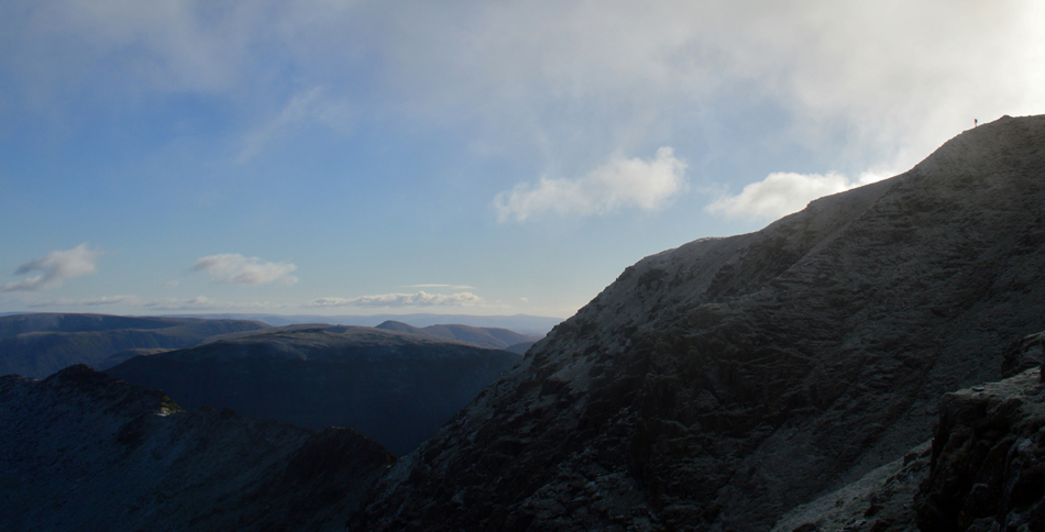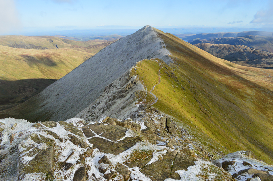 Striking views over Striding Edge, Helvellyn and Catstye Cam as we shoulder the summit of Birkhouse Moor. |